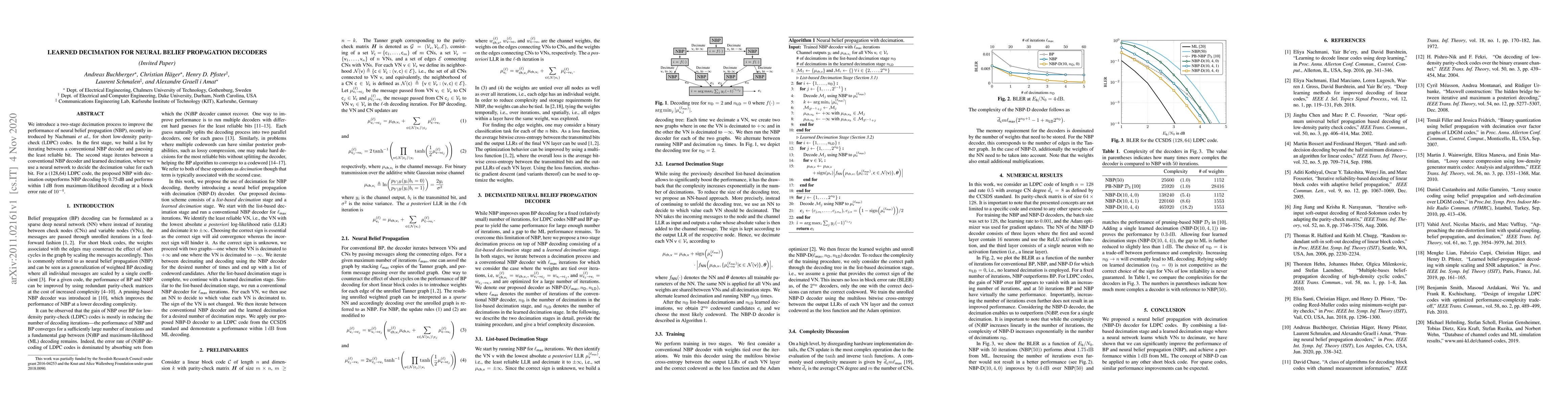 This paper proposes a two-stage decimation process to enhance neural belief propagation decoders for short LDPC codes. The method combines conventional NBP with learned decimation using a neural network, achieving 0.75 dB improvement over standard NBP and near-optimal performance.