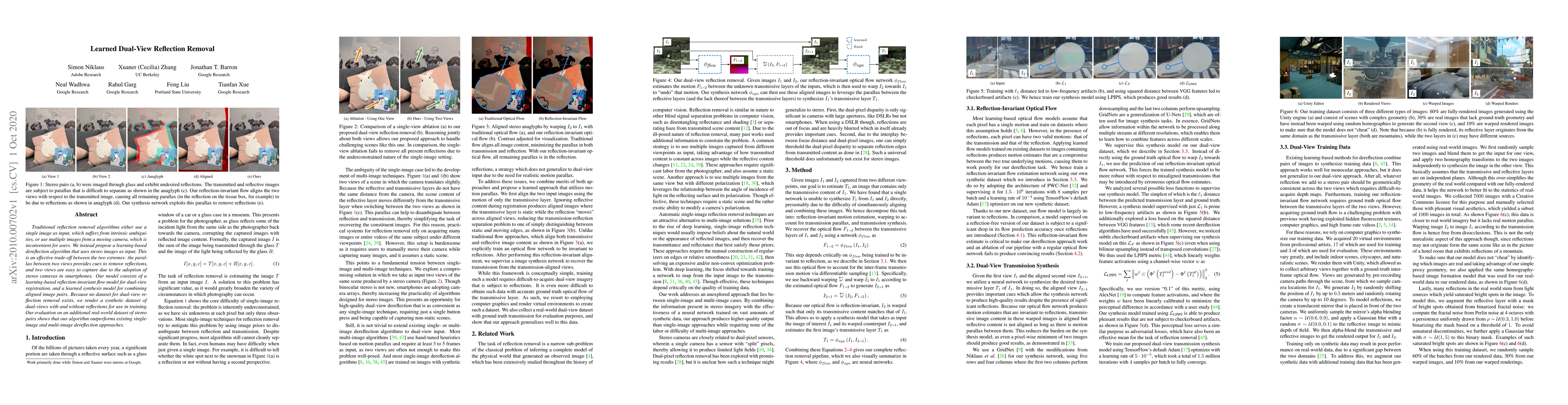 Traditional reflection removal algorithms either use a single image as input, which suffers from intrinsic ambiguities, or use multiple images from a moving camera, which is inconvenient for users. We instead propose a learning-based dereflection algorithm that uses stereo images as input. This is an effective trade-off between the two extremes: the parallax between two views provides cues to remove reflections, and two views are easy to capture due to the adoption of stereo cameras in smartphones. Our model consists of a learning-based reflection-invariant flow model for dual-view registration, and a learned synthesis model for combining aligned image pairs. Because no dataset for dual-view reflection removal exists, we render a synthetic dataset of dual-views with and without reflections for use in training. Our evaluation on an additional real-world dataset of stereo pairs shows that our algorithm outperforms existing single-image and multi-image dereflection approaches.