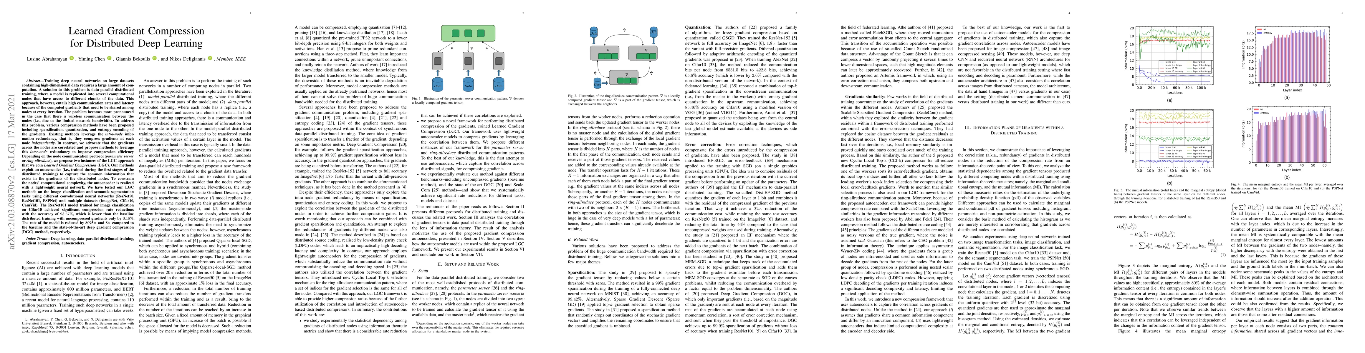 This paper proposes Learned Gradient Compression (LGC) methods to address the high communication costs in distributed deep learning training. LGC leverages inter-node gradient redundancy by using an autoencoder trained to capture common gradient information across nodes, achieving effective compression without significantly impacting model accuracy.