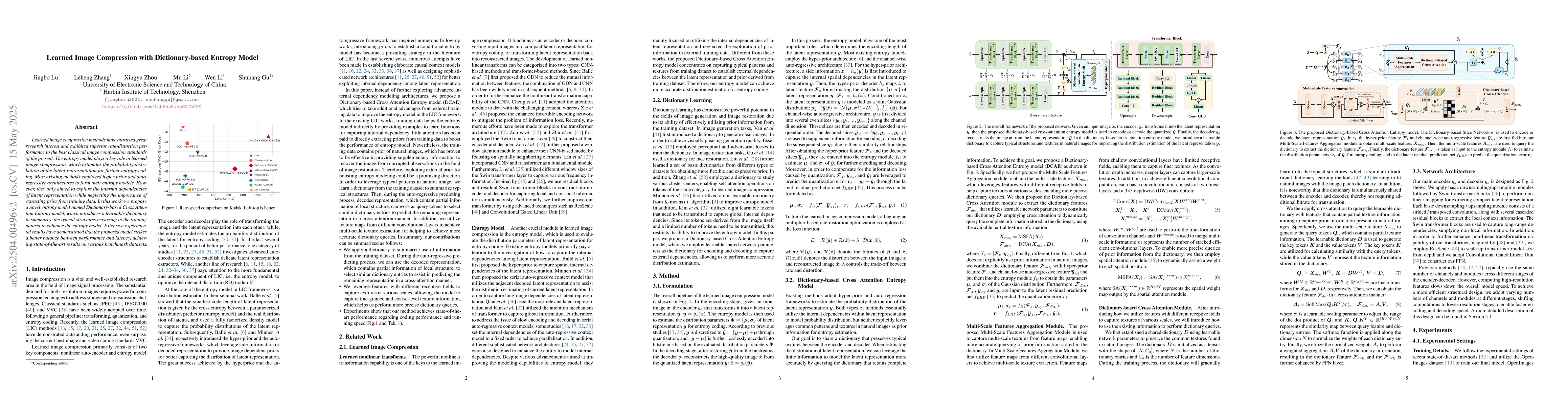 The main technical contribution is the Dictionary-based Cross Attention Entropy (DCAE) model, which incorporates a learnable dictionary to capture typical image structures, improving entropy modeling in learned image compression.