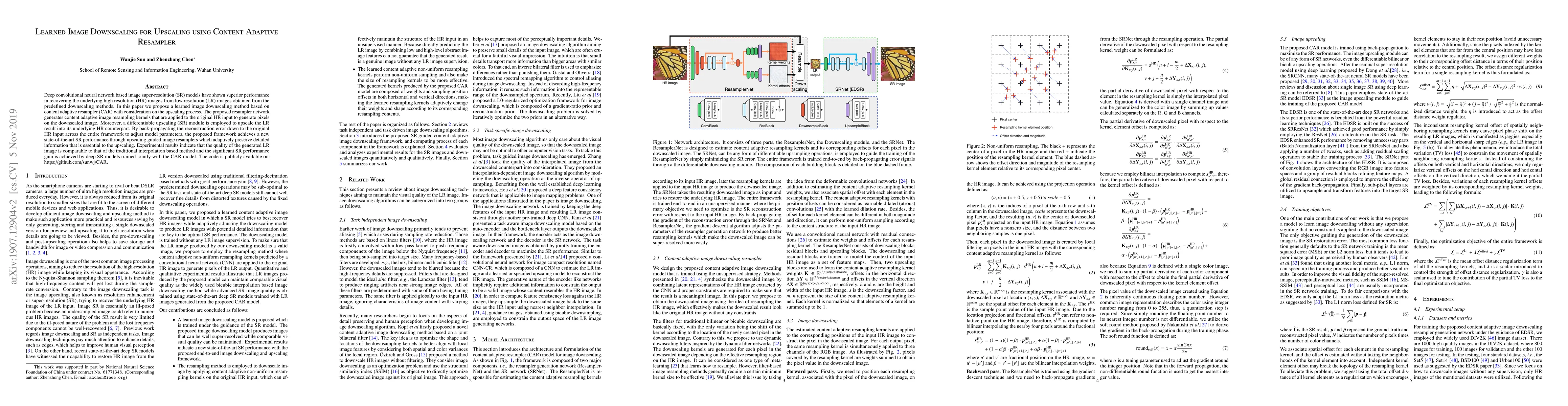 This paper proposes a learned image downscaling method using a content adaptive resampler (CAR) that generates adaptive resampling kernels for downscaling, followed by a differentiable upscaling module to recover high-resolution images. The framework achieves state-of-the-art super-resolution performance by back-propagating reconstruction errors to adjust model parameters.