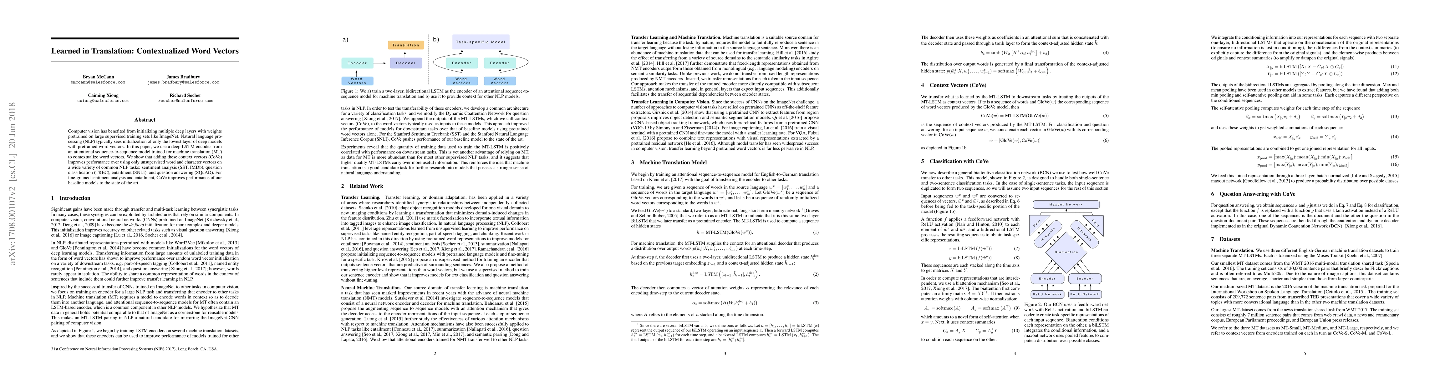 This paper introduces contextualized word vectors (CoVe) derived from a deep LSTM encoder in a machine translation model, demonstrating improved performance over traditional word vectors in various NLP tasks, including sentiment analysis, question classification, entailment, and question answering. The CoVe approach achieves state-of-the-art results for fine-grained sentiment analysis and entailment.