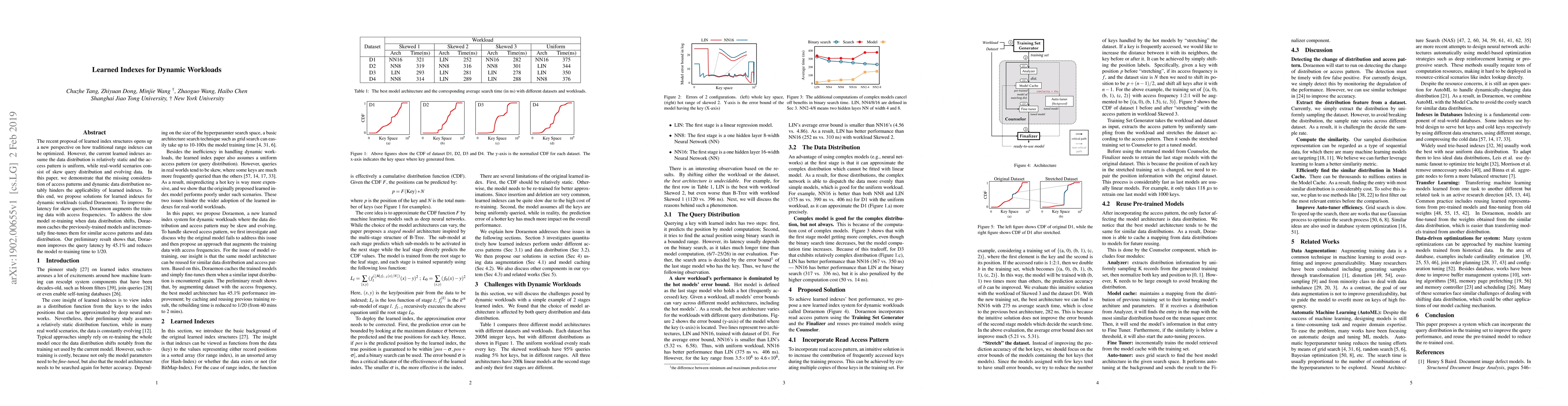 This paper proposes "Doraemon," a solution for learned indexes to handle dynamic workloads with skew query distributions and evolving data. It improves latency for skew queries and reduces model re-training time by caching previous models and incrementally fine-tuning them, achieving a 45.1% reduction in query latency and a 20x reduction in re-training time.