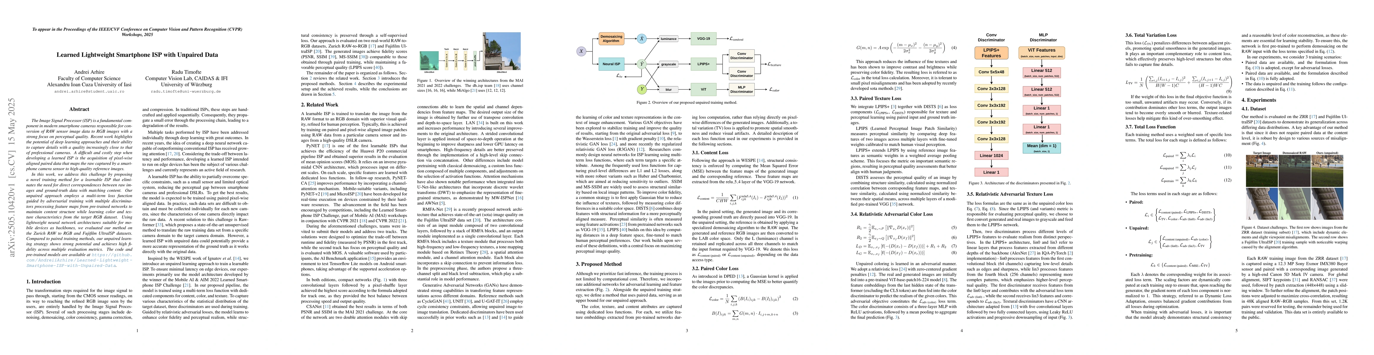 The main technical contribution is the development of an unpaired training method for lightweight smartphone ISPs using adversarial training and multiple discriminators, which maintains content structure while learning color and texture characteristics.