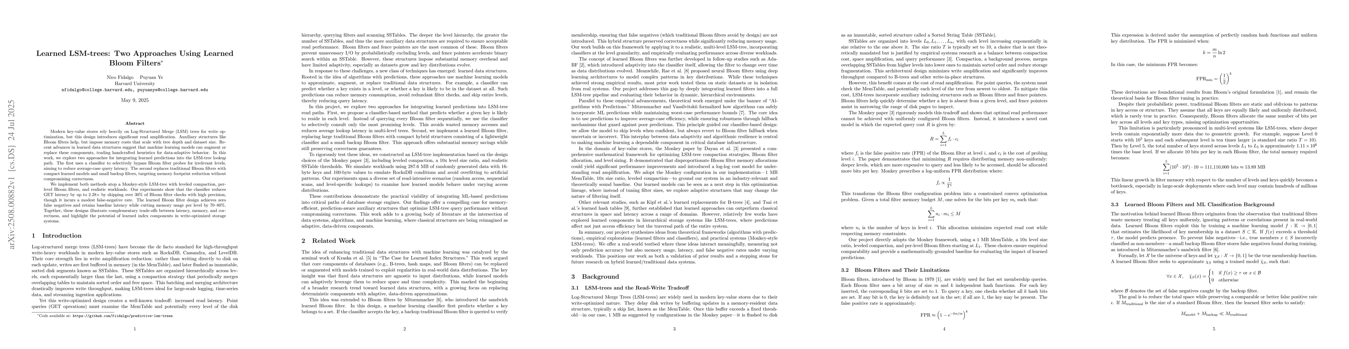 Modern key-value stores rely heavily on Log-Structured Merge (LSM) trees for write optimization, but this design introduces significant read amplification. Auxiliary structures like Bloom filters help, but impose memory costs that scale with tree depth and dataset size. Recent advances in learned data structures suggest that machine learning models can augment or replace these components, trading handcrafted heuristics for data-adaptive behavior. In this work, we explore two approaches for integrating learned predictions into the LSM-tree lookup path. The first uses a classifier to selectively bypass Bloom filter probes for irrelevant levels, aiming to reduce average-case query latency. The second replaces traditional Bloom filters with compact learned models and small backup filters, targeting memory footprint reduction without compromising correctness. We implement both methods atop a Monkey-style LSM-tree with leveled compaction, per-level Bloom filters, and realistic workloads. Our experiments show that the classifier reduces GET latency by up to 2.28x by skipping over 30% of Bloom filter checks with high precision, though it incurs a modest false-negative rate. The learned Bloom filter design achieves zero false negatives and retains baseline latency while cutting memory usage per level by 70-80%. Together, these designs illustrate complementary trade-offs between latency, memory, and correctness, and highlight the potential of learned index components in write-optimized storage systems.