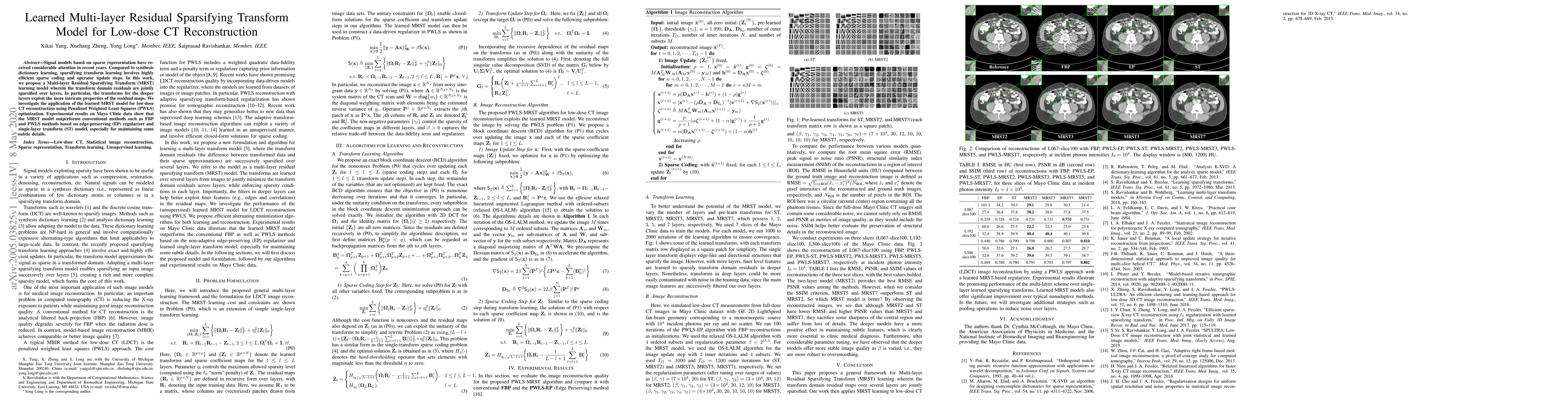This paper proposes a Multi-layer Residual Sparsifying Transform (MRST) model for low-dose CT reconstruction, which outperforms conventional methods by efficiently sparsifying transform domain residuals across layers. Experimental results on Mayo Clinic data demonstrate superior performance in detail preservation compared to FBP and PWLS methods.