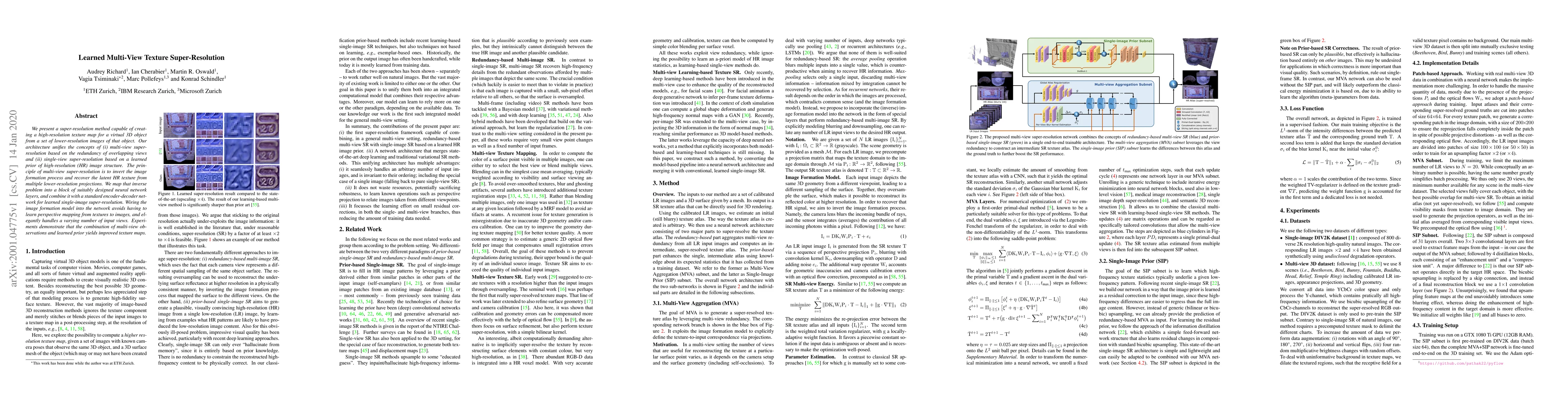 This paper introduces a super-resolution technique that generates high-resolution texture maps for 3D objects using multiple low-resolution images. It combines multi-view super-resolution with single-view super-resolution, leveraging neural networks to recover high-resolution textures from multiple projections, achieving superior results.