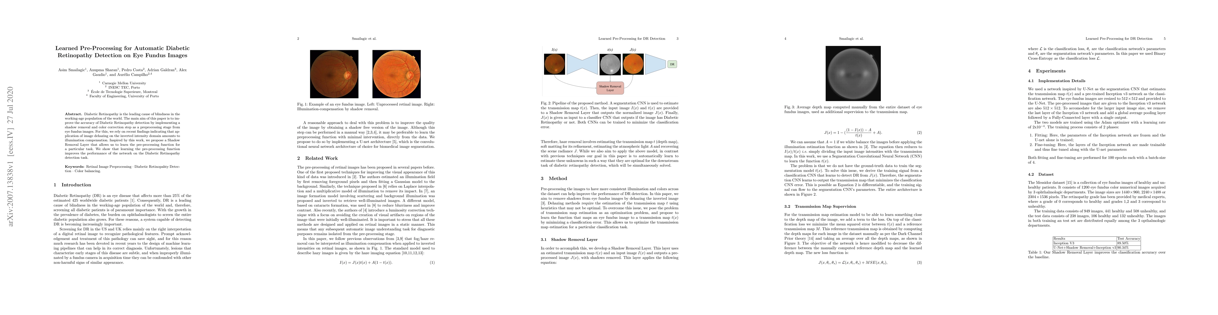 Diabetic Retinopathy is the leading cause of blindness in the working-age population of the world. The main aim of this paper is to improve the accuracy of Diabetic Retinopathy detection by implementing a shadow removal and color correction step as a preprocessing stage from eye fundus images. For this, we rely on recent findings indicating that application of image dehazing on the inverted intensity domain amounts to illumination compensation. Inspired by this work, we propose a Shadow Removal Layer that allows us to learn the pre-processing function for a particular task. We show that learning the pre-processing function improves the performance of the network on the Diabetic Retinopathy detection task.