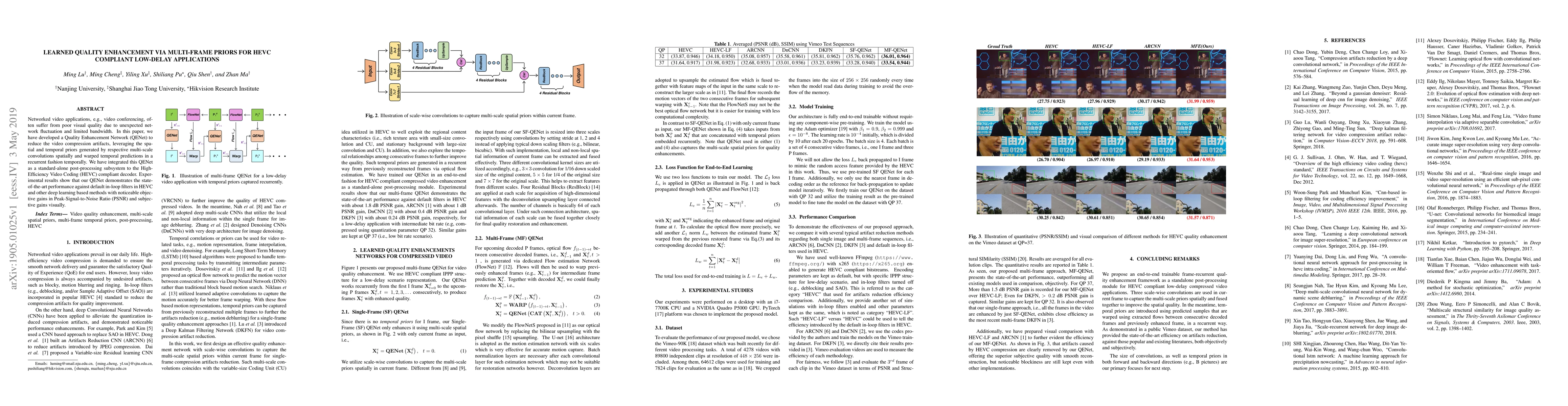 This paper proposes a Quality Enhancement Network (QENet) to improve video quality in low-delay applications like video conferencing by reducing compression artifacts. QENet leverages spatial and temporal priors through multi-scale convolutions and recurrent temporal predictions, integrated into the HEVC decoder, achieving superior performance in PSNR and visual quality compared to default HEVC filters and other deep learning methods.