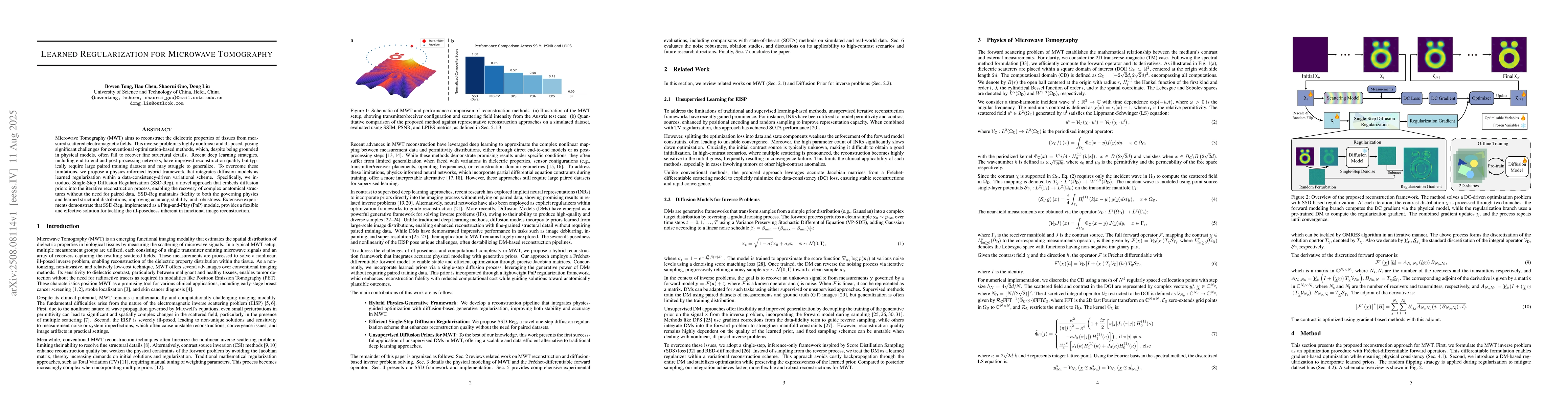 Microwave Tomography (MWT) aims to reconstruct the dielectric properties of tissues from measured scattered electromagnetic fields. This inverse problem is highly nonlinear and ill-posed, posing significant challenges for conventional optimization-based methods, which, despite being grounded in physical models, often fail to recover fine structural details. Recent deep learning strategies, including end-to-end and post-processing networks, have improved reconstruction quality but typically require large paired training datasets and may struggle to generalize. To overcome these limitations, we propose a physics-informed hybrid framework that integrates diffusion models as learned regularization within a data-consistency-driven variational scheme. Specifically, we introduce Single-Step Diffusion Regularization (SSD-Reg), a novel approach that embeds diffusion priors into the iterative reconstruction process, enabling the recovery of complex anatomical structures without the need for paired data. SSD-Reg maintains fidelity to both the governing physics and learned structural distributions, improving accuracy, stability, and robustness. Extensive experiments demonstrate that SSD-Reg, implemented as a Plug-and-Play (PnP) module, provides a flexible and effective solution for tackling the ill-posedness inherent in functional image reconstruction.