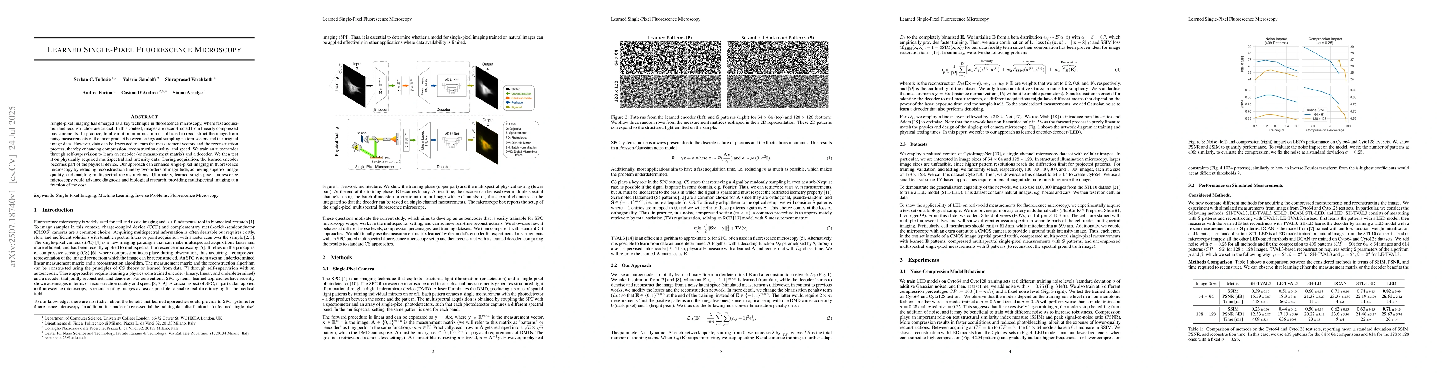 Single-pixel imaging has emerged as a key technique in fluorescence microscopy, where fast acquisition and reconstruction are crucial. In this context, images are reconstructed from linearly compressed measurements. In practice, total variation minimisation is still used to reconstruct the image from noisy measurements of the inner product between orthogonal sampling pattern vectors and the original image data. However, data can be leveraged to learn the measurement vectors and the reconstruction process, thereby enhancing compression, reconstruction quality, and speed. We train an autoencoder through self-supervision to learn an encoder (or measurement matrix) and a decoder. We then test it on physically acquired multispectral and intensity data. During acquisition, the learned encoder becomes part of the physical device. Our approach can enhance single-pixel imaging in fluorescence microscopy by reducing reconstruction time by two orders of magnitude, achieving superior image quality, and enabling multispectral reconstructions. Ultimately, learned single-pixel fluorescence microscopy could advance diagnosis and biological research, providing multispectral imaging at a fraction of the cost.