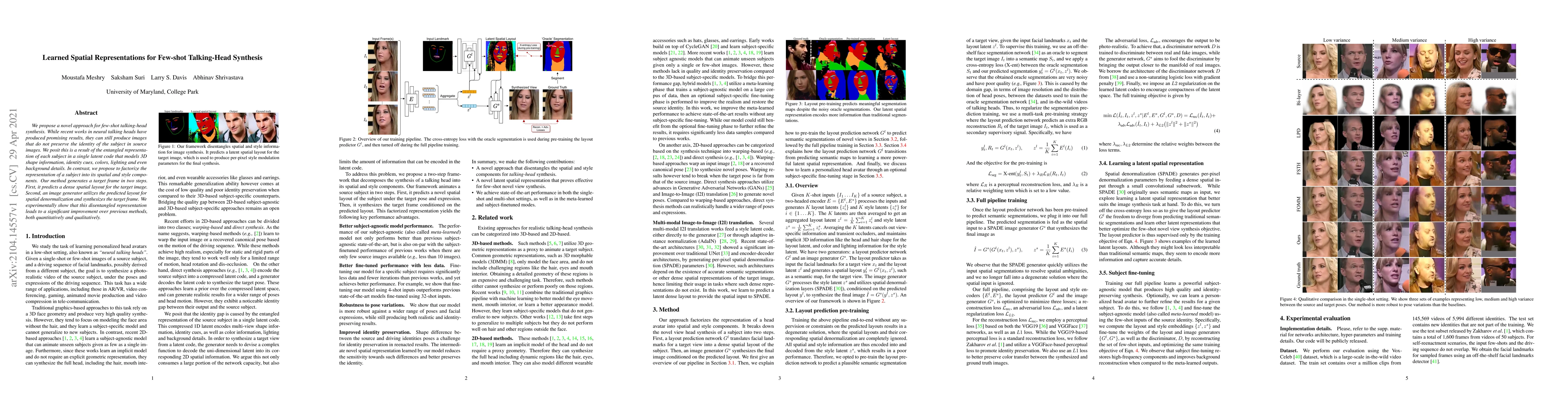 This paper introduces a novel method for few-shot talking-head synthesis by factorizing the representation of a subject into spatial and style components, leading to improved identity preservation. The approach predicts a dense spatial layout and uses it for spatial denormalization, achieving better results than previous methods.