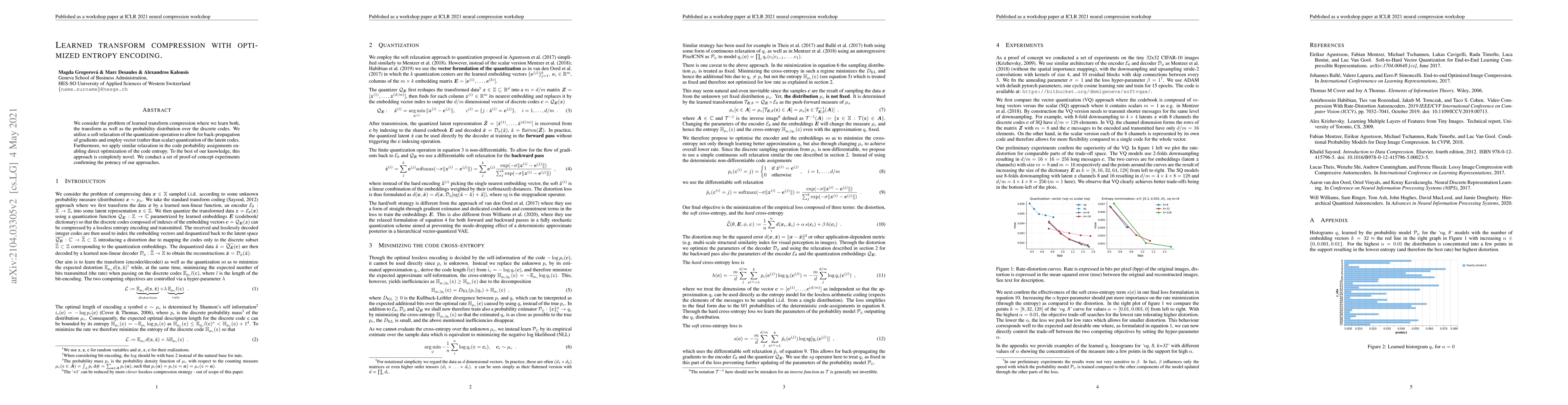 We consider the problem of learned transform compression where we learn both, the transform as well as the probability distribution over the discrete codes. We utilize a soft relaxation of the quantization operation to allow for back-propagation of gradients and employ vector (rather than scalar) quantization of the latent codes. Furthermore, we apply similar relaxation in the code probability assignments enabling direct optimization of the code entropy. To the best of our knowledge, this approach is completely novel. We conduct a set of proof-of concept experiments confirming the potency of our approaches.