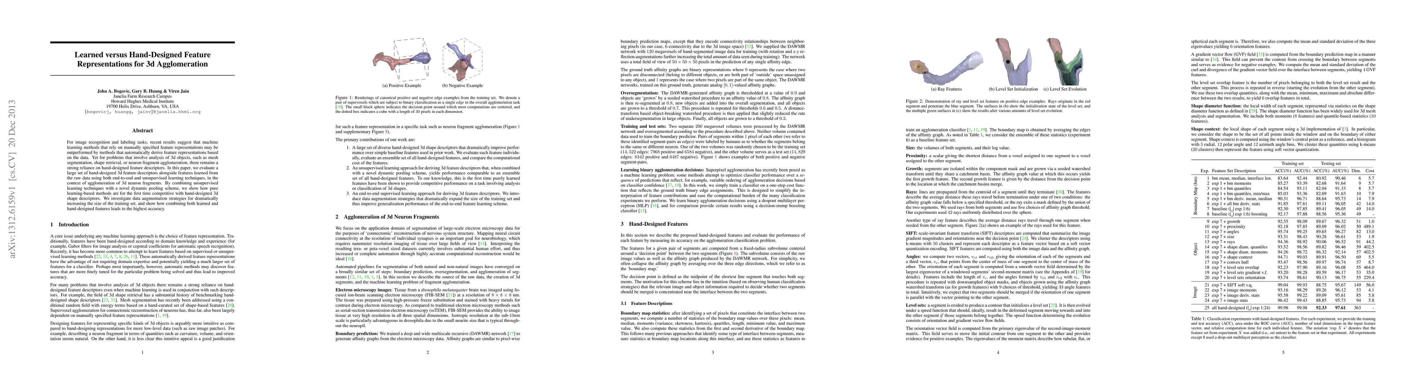 For image recognition and labeling tasks, recent results suggest that machine learning methods that rely on manually specified feature representations may be outperformed by methods that automatically derive feature representations based on the data. Yet for problems that involve analysis of 3d objects, such as mesh segmentation, shape retrieval, or neuron fragment agglomeration, there remains a strong reliance on hand-designed feature descriptors. In this paper, we evaluate a large set of hand-designed 3d feature descriptors alongside features learned from the raw data using both end-to-end and unsupervised learning techniques, in the context of agglomeration of 3d neuron fragments. By combining unsupervised learning techniques with a novel dynamic pooling scheme, we show how pure learning-based methods are for the first time competitive with hand-designed 3d shape descriptors. We investigate data augmentation strategies for dramatically increasing the size of the training set, and show how combining both learned and hand-designed features leads to the highest accuracy.