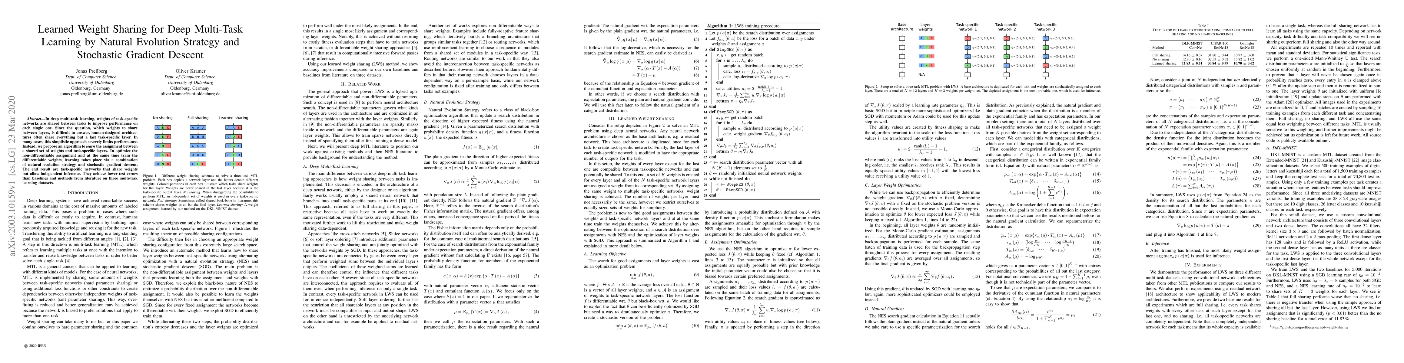 This paper proposes an algorithm combining natural evolution strategy and stochastic gradient descent to learn optimal weight sharing in deep multi-task learning, achieving lower test errors than baselines on three datasets. The method allows independent inference by dynamically assigning shared weights to task-specific layers.