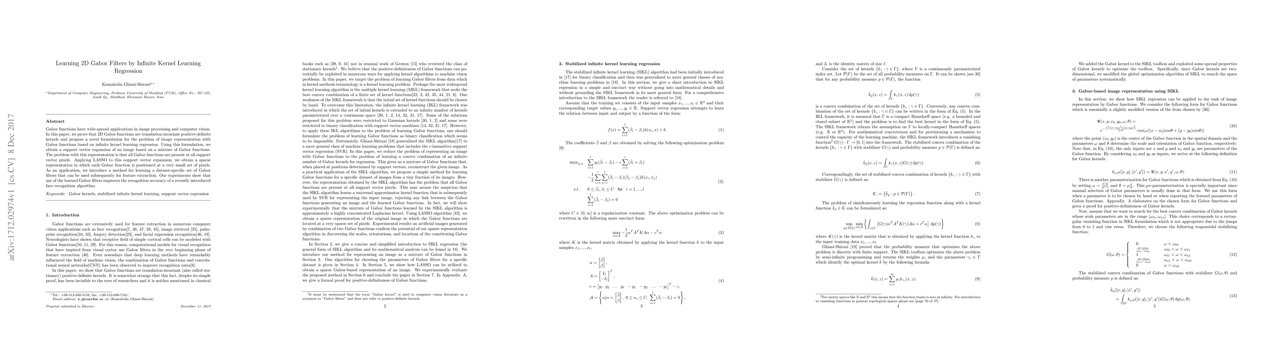 This paper proposes a novel method for learning 2D Gabor filters using infinite kernel learning regression, achieving a sparse representation by applying LASSO. The learned dataset-specific Gabor filters enhance the recognition accuracy of a face recognition algorithm.