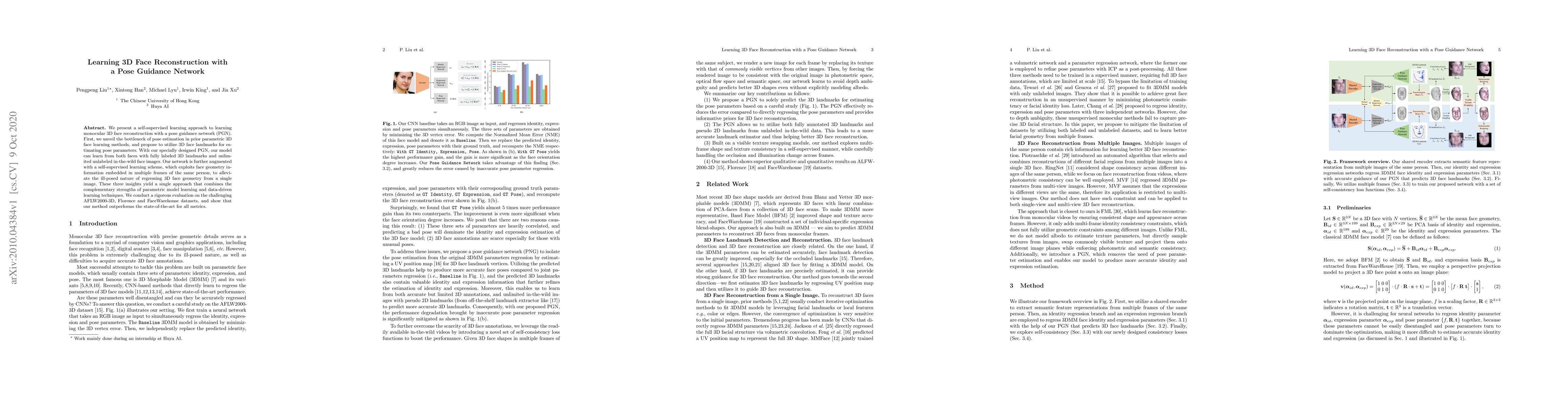 This paper introduces a self-supervised learning method for monocular 3D face reconstruction using a pose guidance network, which leverages 3D face landmarks for pose estimation and self-supervised learning from unlabeled data to improve accuracy. The proposed approach outperforms existing methods on multiple datasets.