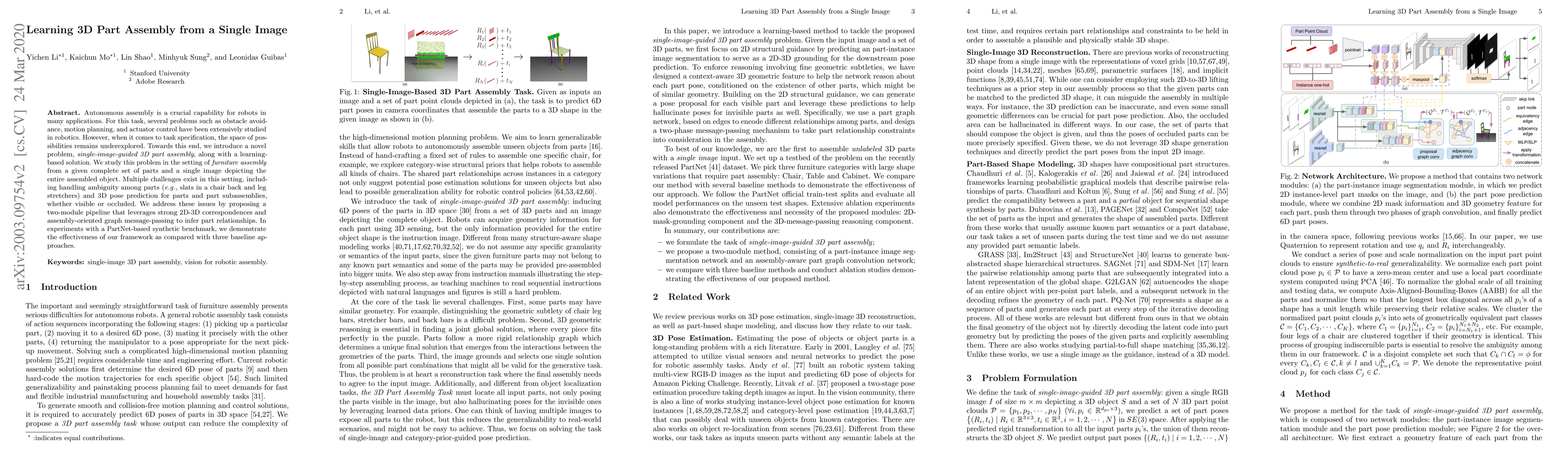 This paper introduces a novel method for 3D part assembly from a single image, addressing challenges like part ambiguity and 3D pose prediction. It proposes a two-module pipeline using 2D-3D correspondences and graph message-passing to infer part relationships, demonstrating effectiveness on a synthetic benchmark.
