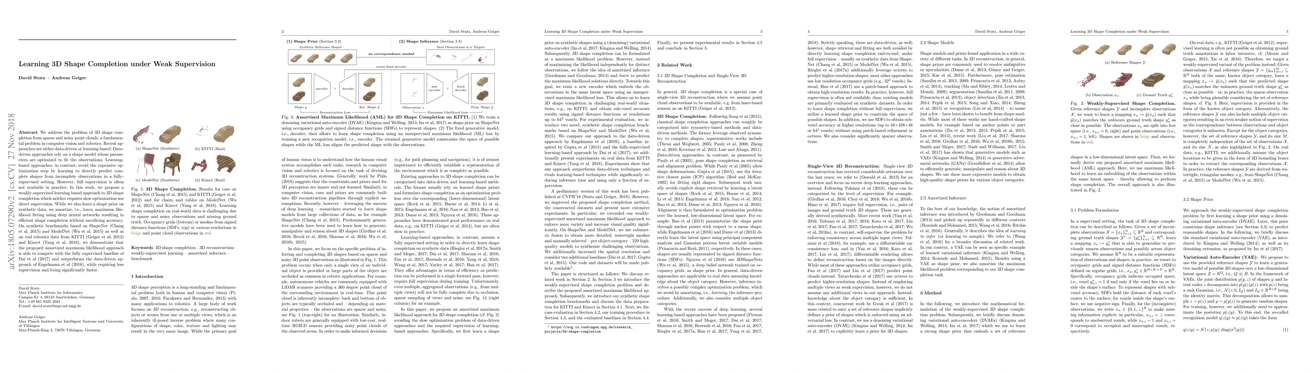 The paper proposes a weakly-supervised learning-based approach for 3D shape completion from sparse and noisy point clouds using a denoising variational autoencoder (DVAE). The approach learns a latent space of shapes for one or multiple object categories from synthetic data, formulating shape completion as a maximum likelihood problem. A recognition model (encoder) is then trained to amortize this problem, allowing for efficient shape completion with less supervision.