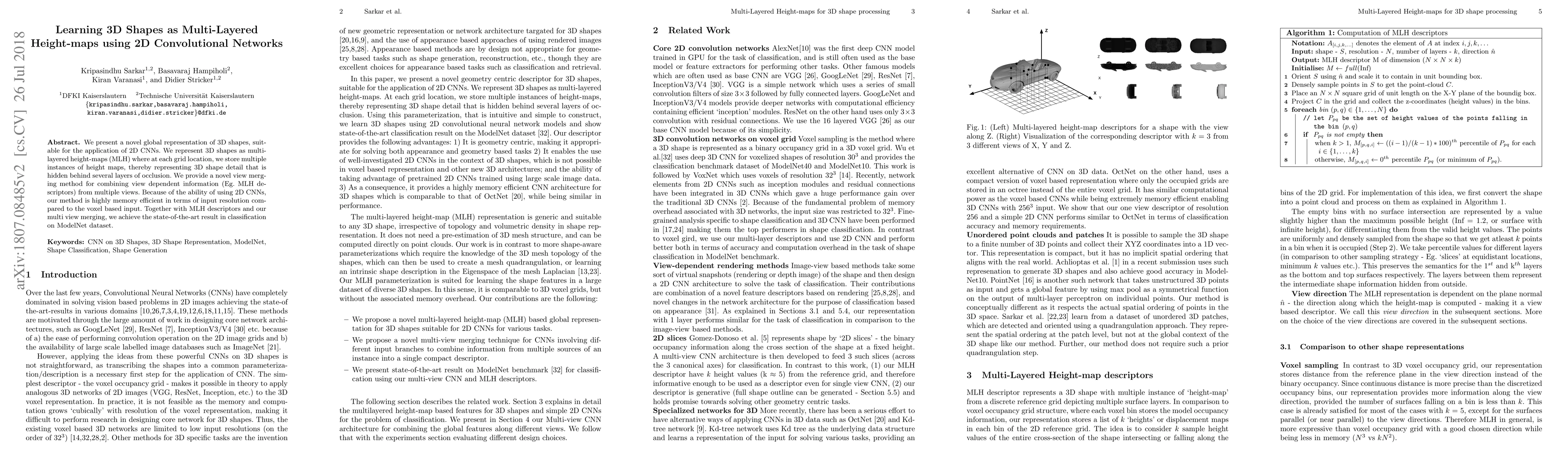 We present a novel global representation of 3D shapes, suitable for the application of 2D CNNs. We represent 3D shapes as multi-layered height-maps (MLH) where at each grid location, we store multiple instances of height maps, thereby representing 3D shape detail that is hidden behind several layers of occlusion. We provide a novel view merging method for combining view dependent information (Eg. MLH descriptors) from multiple views. Because of the ability of using 2D CNNs, our method is highly memory efficient in terms of input resolution compared to the voxel based input. Together with MLH descriptors and our multi view merging, we achieve the state-of-the-art result in classification on ModelNet dataset.