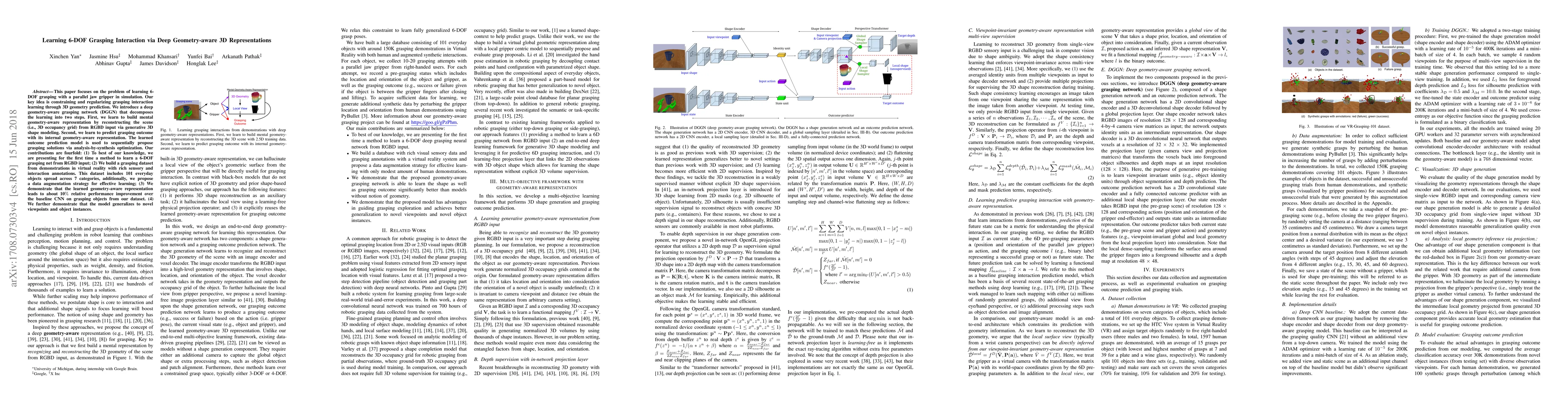 This paper introduces a method for learning 6-DOF grasping using deep geometry-aware 3D representations, proposing a generative 3D shape modeling approach to reconstruct scene geometry from RGBD input. The authors demonstrate a 10 percent relative performance improvement over baseline CNNs and show the model's generalization to novel viewpoints and objects.