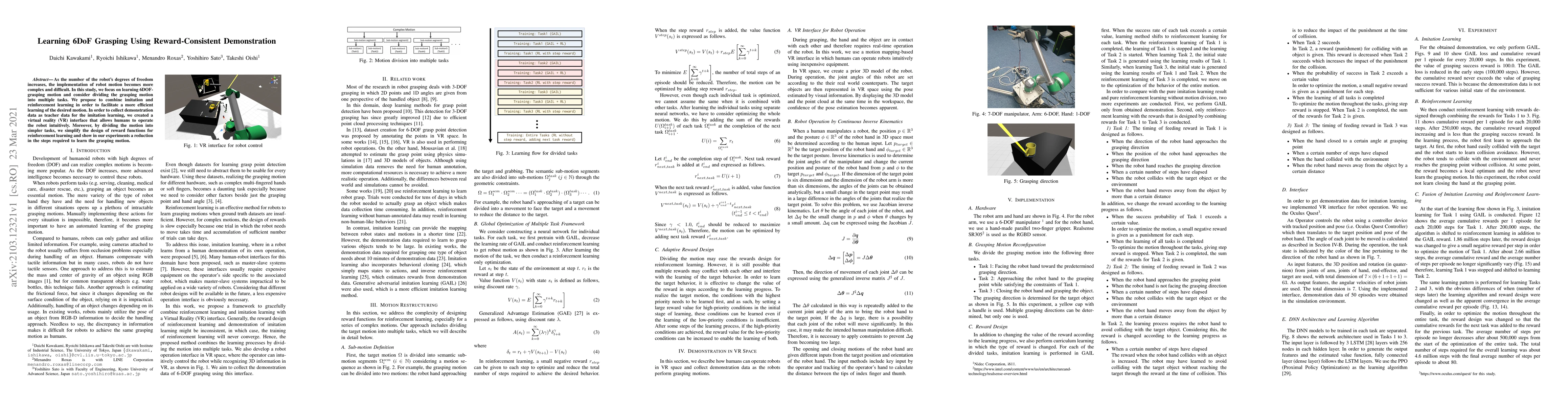 This paper proposes a method combining imitation and reinforcement learning to efficiently teach a robot 6DoF grasping by breaking down the task into simpler components. A VR interface is used to gather demonstration data, which aids in reducing the learning steps required for grasping motion.