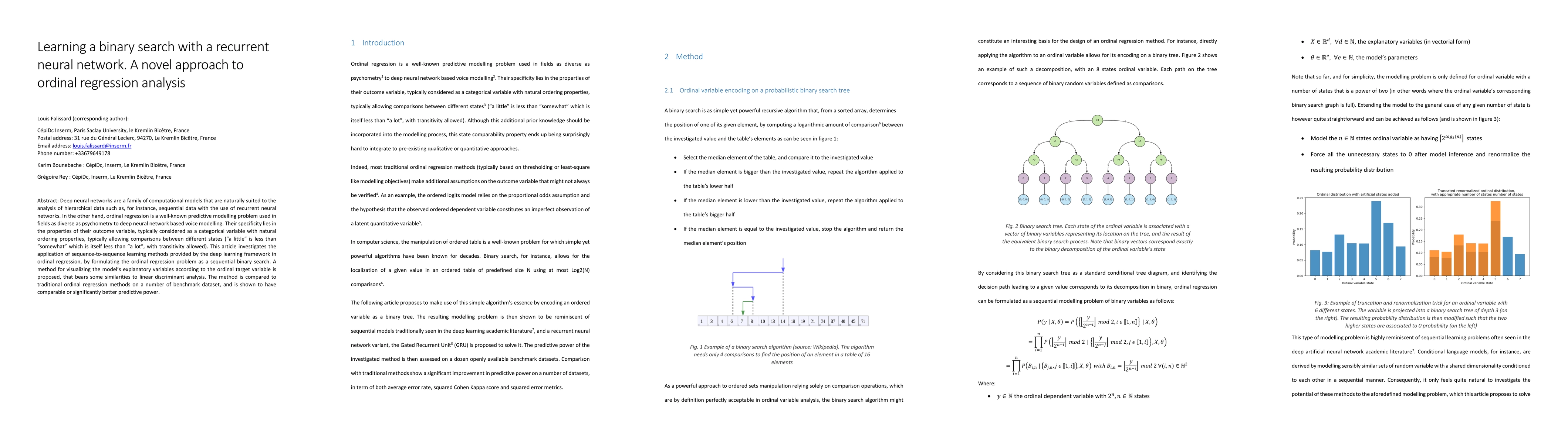This paper explores a novel approach to ordinal regression analysis using recurrent neural networks for sequential binary search. The proposed method demonstrates comparable or superior predictive performance compared to traditional ordinal regression techniques on benchmark datasets.
