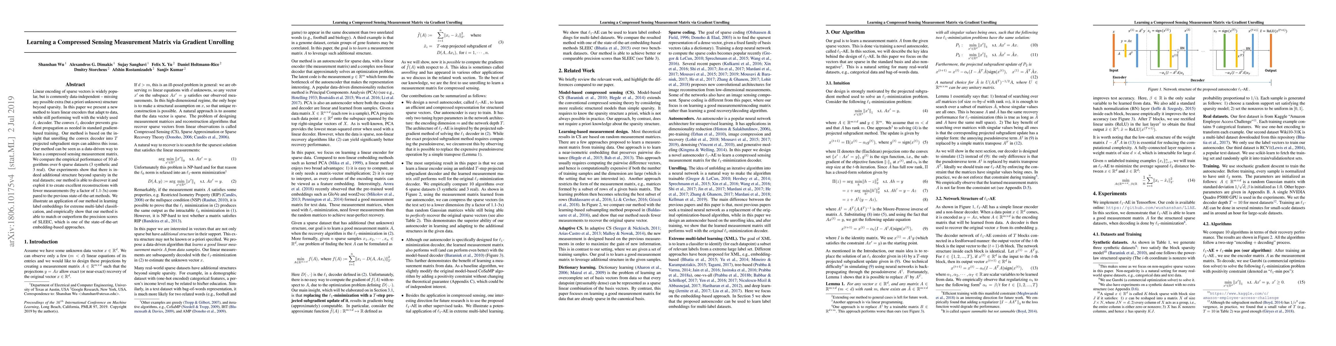 A new method learns a compressed sensing measurement matrix that adapts to data, improving reconstruction quality with fewer measurements, and outperforming state-of-the-art methods in applications like extreme multi-label classification.