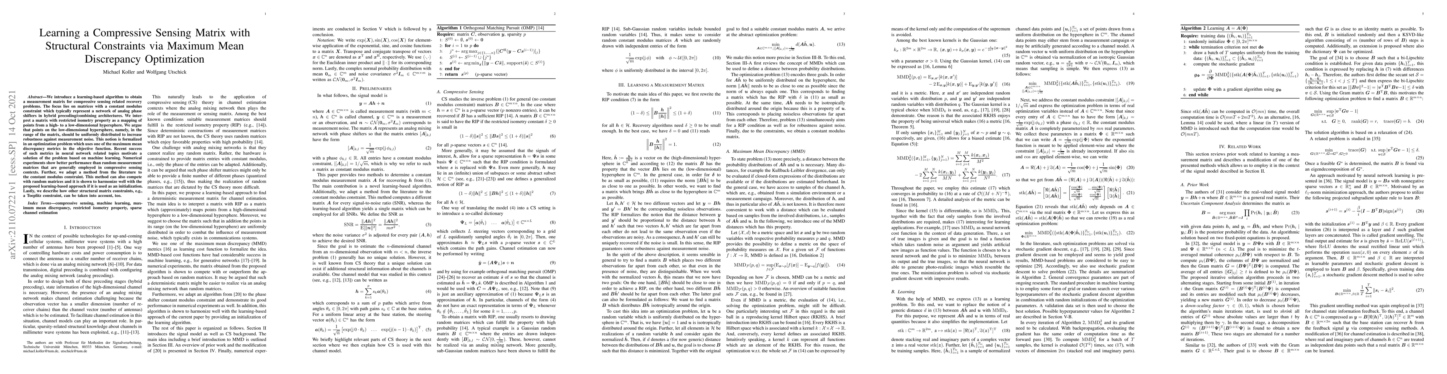 We introduce a learning-based algorithm to obtain a measurement matrix for compressive sensing related recovery problems. The focus lies on matrices with a constant modulus constraint which typically represent a network of analog phase shifters in hybrid precoding/combining architectures. We interpret a matrix with restricted isometry property as a mapping of points from a high- to a low-dimensional hypersphere. We argue that points on the low-dimensional hypersphere, namely, in the range of the matrix, should be uniformly distributed to increase robustness against measurement noise. This notion is formalized in an optimization problem which uses one of the maximum mean discrepancy metrics in the objective function. Recent success of such metrics in neural network related topics motivate a solution of the problem based on machine learning. Numerical experiments show better performance than random measurement matrices that are generally employed in compressive sensing contexts. Further, we adapt a method from the literature to the constant modulus constraint. This method can also compete with random matrices and it is shown to harmonize well with the proposed learning-based approach if it is used as an initialization. Lastly, we describe how other structural matrix constraints, e.g., a Toeplitz constraint, can be taken into account, too.
