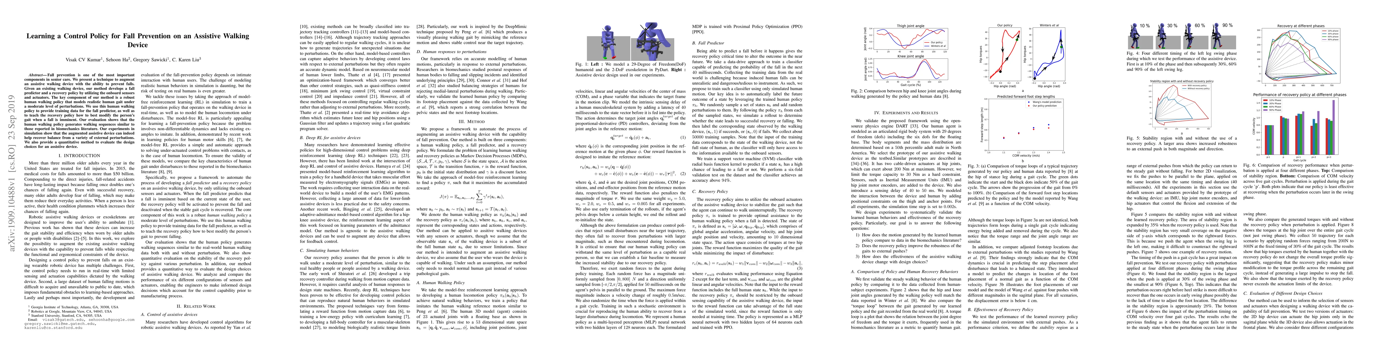Fall prevention is one of the most important components in senior care. We present a technique to augment an assistive walking device with the ability to prevent falls. Given an existing walking device, our method develops a fall predictor and a recovery policy by utilizing the onboard sensors and actuators. The key component of our method is a robust human walking policy that models realistic human gait under a moderate level of perturbations. We use this human walking policy to provide training data for the fall predictor, as well as to teach the recovery policy how to best modify the person's gait when a fall is imminent. Our evaluation shows that the human walking policy generates walking sequences similar to those reported in biomechanics literature. Our experiments in simulation show that the augmented assistive device can indeed help recover balance from a variety of external perturbations. We also provide a quantitative method to evaluate the design choices for an assistive device.