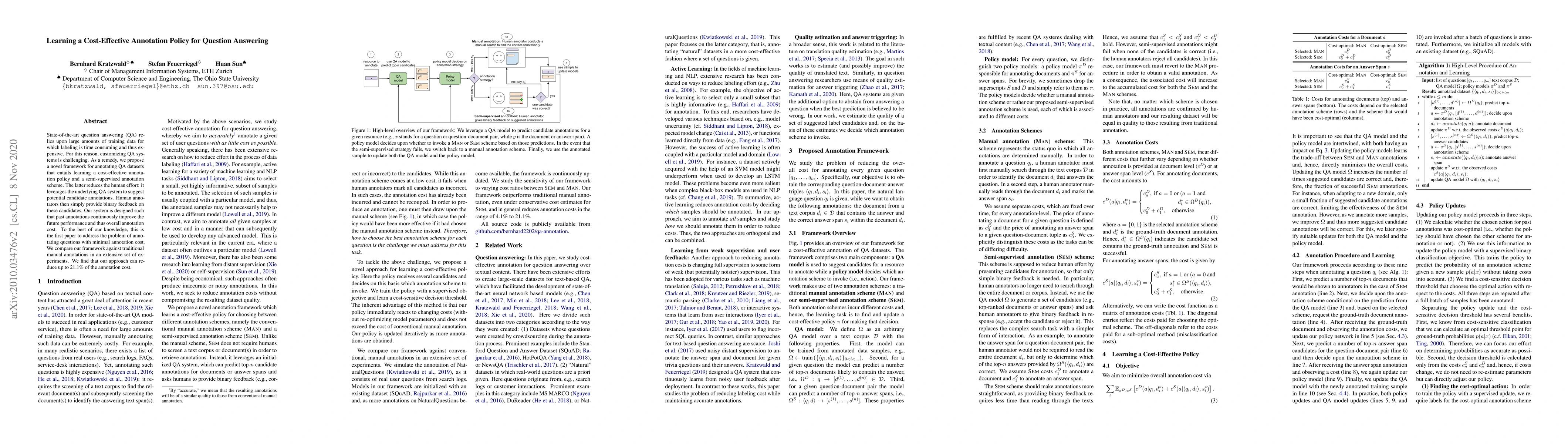 This research proposes a novel framework for cost-effective annotation of question answering (QA) datasets. It combines learning a cost-effective annotation policy with a semi-supervised annotation scheme, reducing human effort by 21.1% on average. The method leverages QA systems to suggest candidate annotations, which human annotators then confirm or reject, continuously improving future performance and lowering annotation costs.
