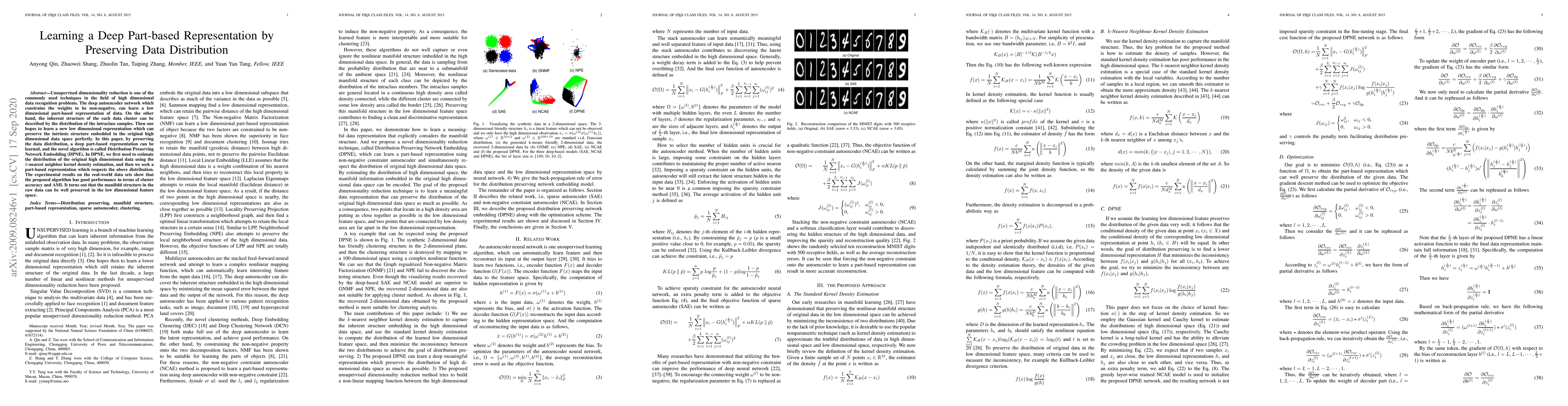 Unsupervised dimensionality reduction is one of the commonly used techniques in the field of high dimensional data recognition problems. The deep autoencoder network which constrains the weights to be non-negative, can learn a low dimensional part-based representation of data. On the other hand, the inherent structure of the each data cluster can be described by the distribution of the intraclass samples. Then one hopes to learn a new low dimensional representation which can preserve the intrinsic structure embedded in the original high dimensional data space perfectly. In this paper, by preserving the data distribution, a deep part-based representation can be learned, and the novel algorithm is called Distribution Preserving Network Embedding (DPNE). In DPNE, we first need to estimate the distribution of the original high dimensional data using the $k$-nearest neighbor kernel density estimation, and then we seek a part-based representation which respects the above distribution. The experimental results on the real-world data sets show that the proposed algorithm has good performance in terms of cluster accuracy and AMI. It turns out that the manifold structure in the raw data can be well preserved in the low dimensional feature space.