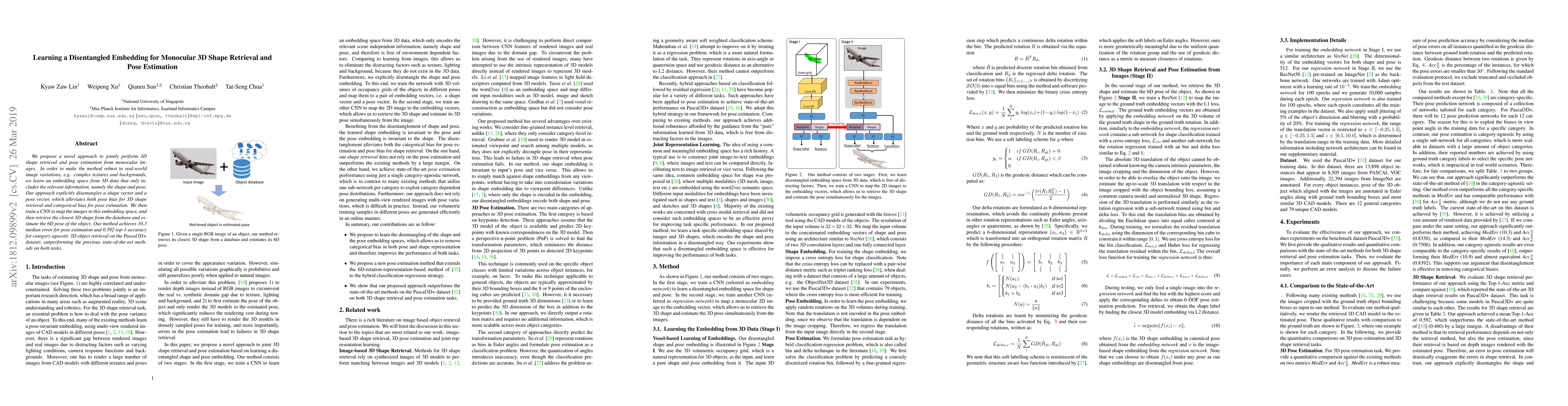 This paper proposes a method for 3D shape retrieval and pose estimation from monocular images using a disentangled embedding space that separates shape and pose information. The approach outperforms previous methods, achieving a median error of 10.3 for pose estimation and a top-1-accuracy of 0.592 for 3D object retrieval on the Pascal3D+ dataset.