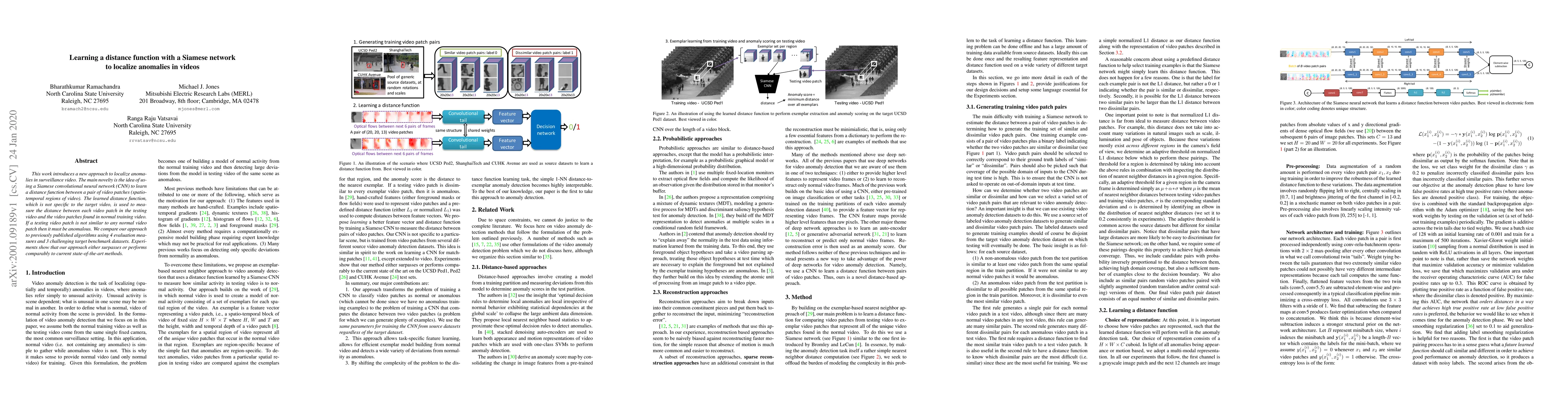 Researchers introduced a new approach using Siamese networks to localize anomalies in surveillance videos by learning a distance function between video patches. Their method outperforms or matches current state-of-the-art methods on challenging benchmark datasets.