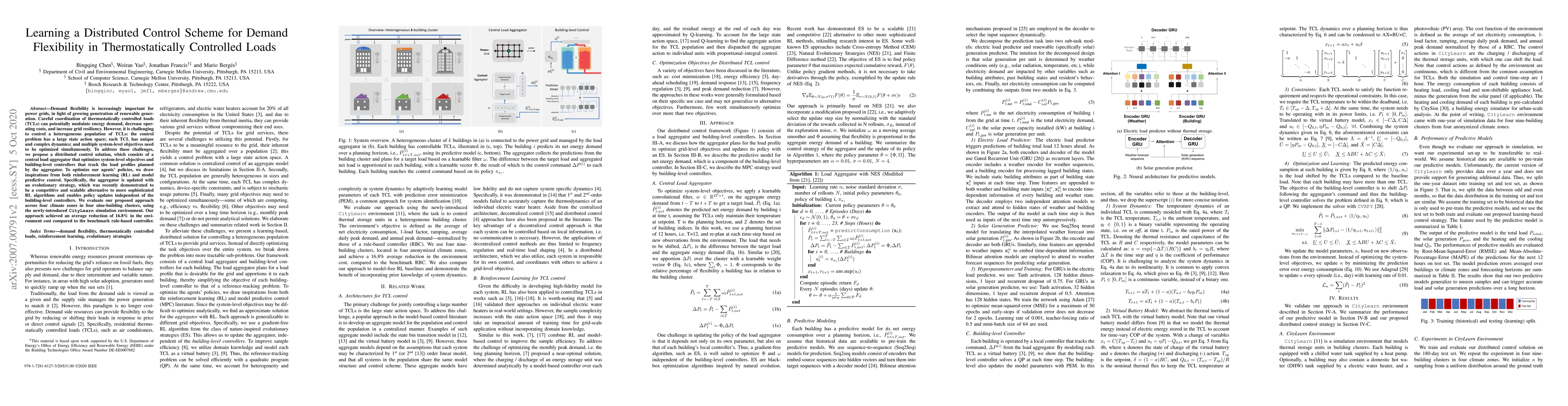 This paper proposes a distributed control scheme to manage demand flexibility in thermostatically controlled loads (TCLs) for power grids, leveraging a central load aggregator and building-level controllers. The approach combines evolutionary strategies and reinforcement learning to optimize system-level objectives, achieving a 16.8% reduction in environment cost compared to a benchmark.