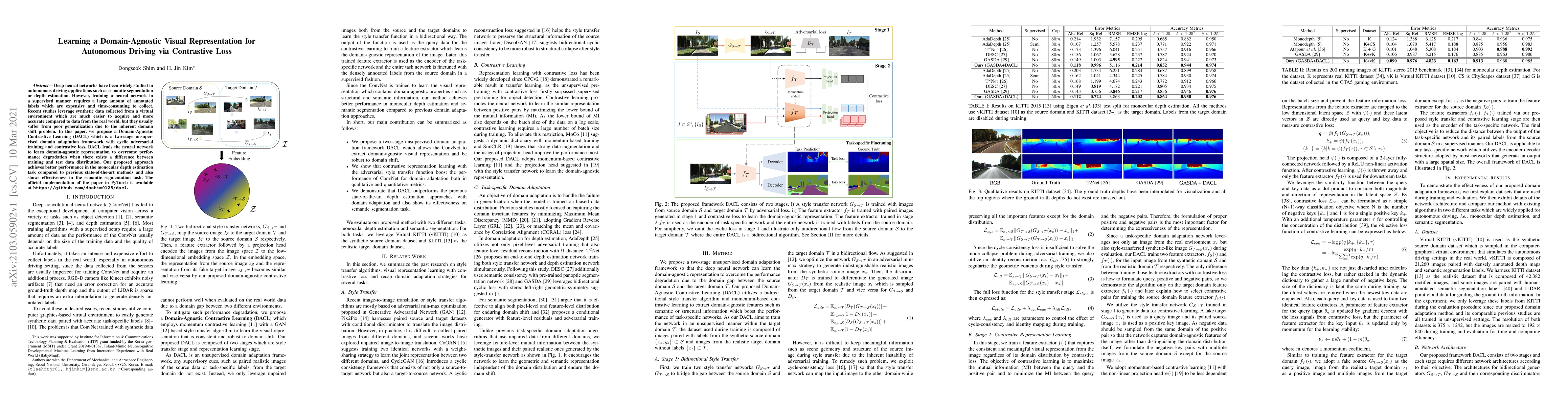 This paper proposes Domain-Agnostic Contrastive Learning (DACL) to address the domain shift problem in autonomous driving applications, enabling unsupervised domain adaptation. DACL combines cyclic adversarial training and contrastive loss to learn domain-agnostic visual representations, achieving superior performance in monocular depth estimation and semantic segmentation.