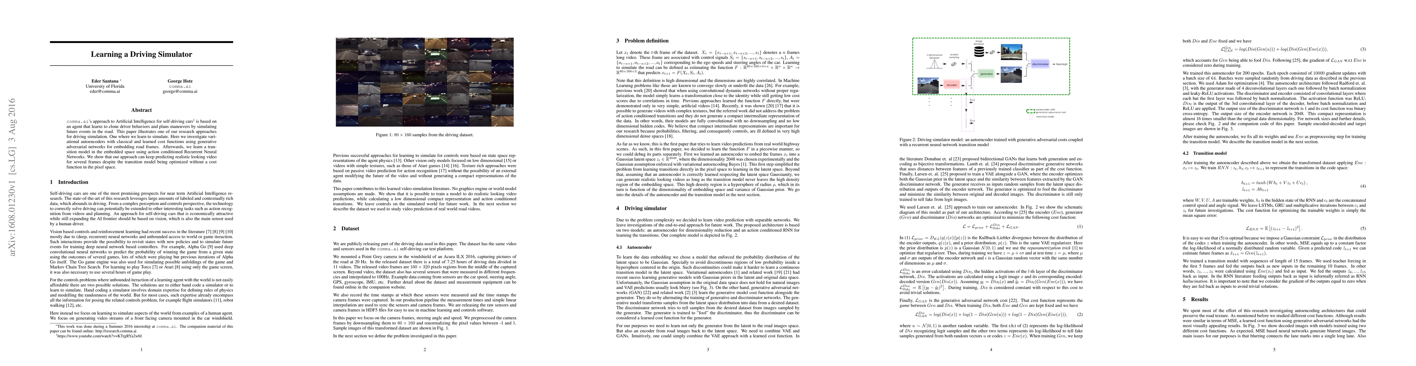 Comma.ai's approach to Artificial Intelligence for self-driving cars is based on an agent that learns to clone driver behaviors and plans maneuvers by simulating future events in the road. This paper illustrates one of our research approaches for driving simulation. One where we learn to simulate. Here we investigate variational autoencoders with classical and learned cost functions using generative adversarial networks for embedding road frames. Afterwards, we learn a transition model in the embedded space using action conditioned Recurrent Neural Networks. We show that our approach can keep predicting realistic looking video for several frames despite the transition model being optimized without a cost function in the pixel space.