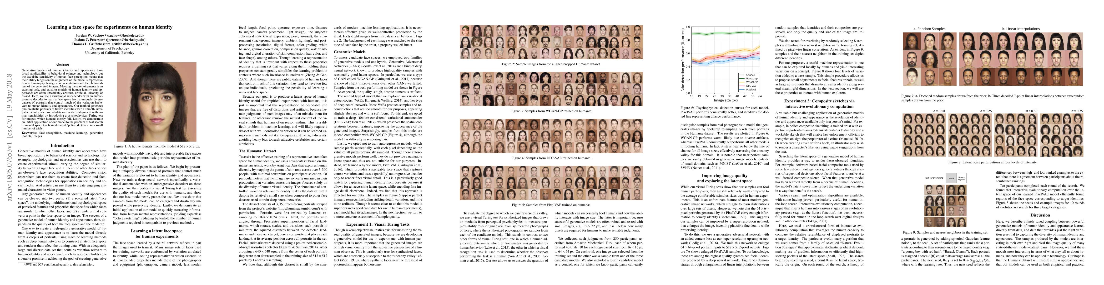 Generative models of human identity and appearance have broad applicability to behavioral science and technology, but the exquisite sensitivity of human face perception means that their utility hinges on the alignment of the model's representation to human psychological representations and the photorealism of the generated images. Meeting these requirements is an exacting task, and existing models of human identity and appearance are often unworkably abstract, artificial, uncanny, or biased. Here, we use a variational autoencoder with an autoregressive decoder to learn a face space from a uniquely diverse dataset of portraits that control much of the variation irrelevant to human identity and appearance. Our method generates photorealistic portraits of fictive identities with a smooth, navigable latent space. We validate our model's alignment with human sensitivities by introducing a psychophysical Turing test for images, which humans mostly fail. Lastly, we demonstrate an initial application of our model to the problem of fast search in mental space to obtain detailed "police sketches" in a small number of trials.