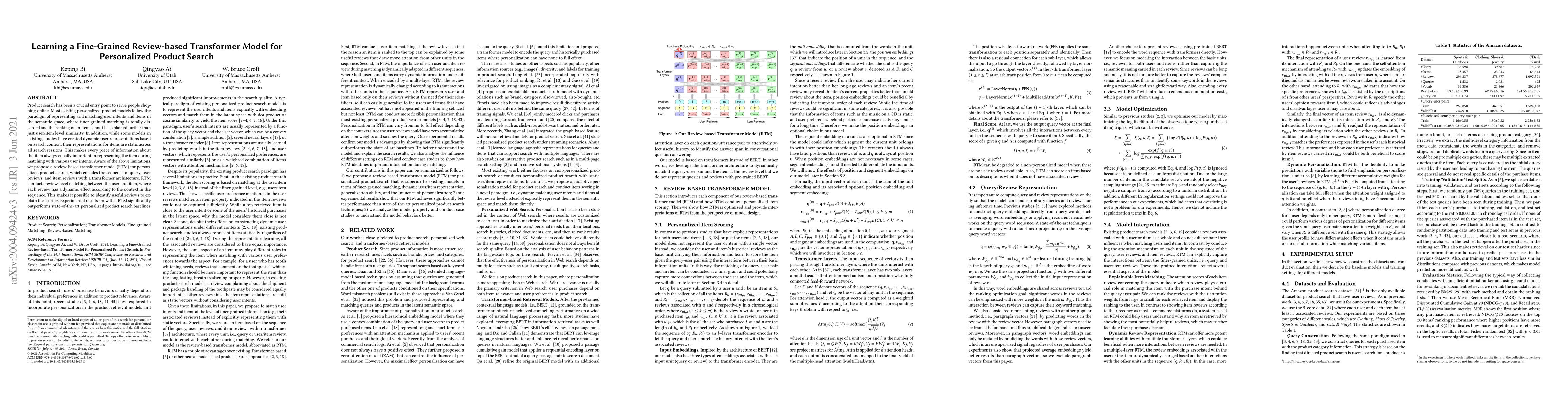 This paper proposes a review-based transformer model (RTM) for personalized product search that encodes query, user reviews, and item reviews to conduct review-level matching, allowing dynamic context-sensitive review importance. RTM outperforms existing models by providing finer-grained matching and explainable item rankings.