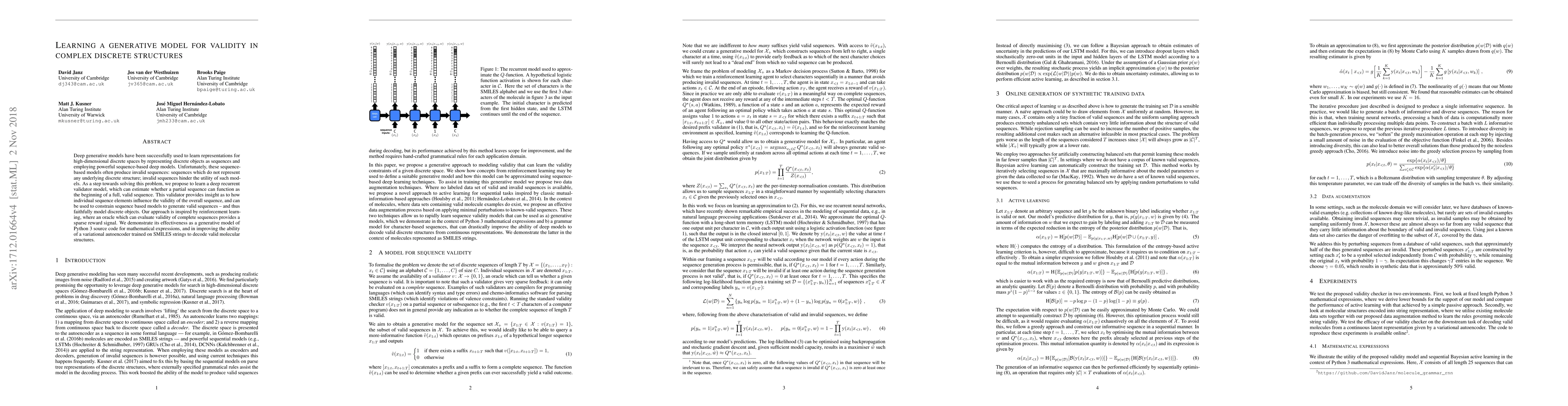Deep generative models have been successfully used to learn representations for high-dimensional discrete spaces by representing discrete objects as sequences and employing powerful sequence-based deep models. Unfortunately, these sequence-based models often produce invalid sequences: sequences which do not represent any underlying discrete structure; invalid sequences hinder the utility of such models. As a step towards solving this problem, we propose to learn a deep recurrent validator model, which can estimate whether a partial sequence can function as the beginning of a full, valid sequence. This validator provides insight as to how individual sequence elements influence the validity of the overall sequence, and can be used to constrain sequence based models to generate valid sequences -- and thus faithfully model discrete objects. Our approach is inspired by reinforcement learning, where an oracle which can evaluate validity of complete sequences provides a sparse reward signal. We demonstrate its effectiveness as a generative model of Python 3 source code for mathematical expressions, and in improving the ability of a variational autoencoder trained on SMILES strings to decode valid molecular structures.