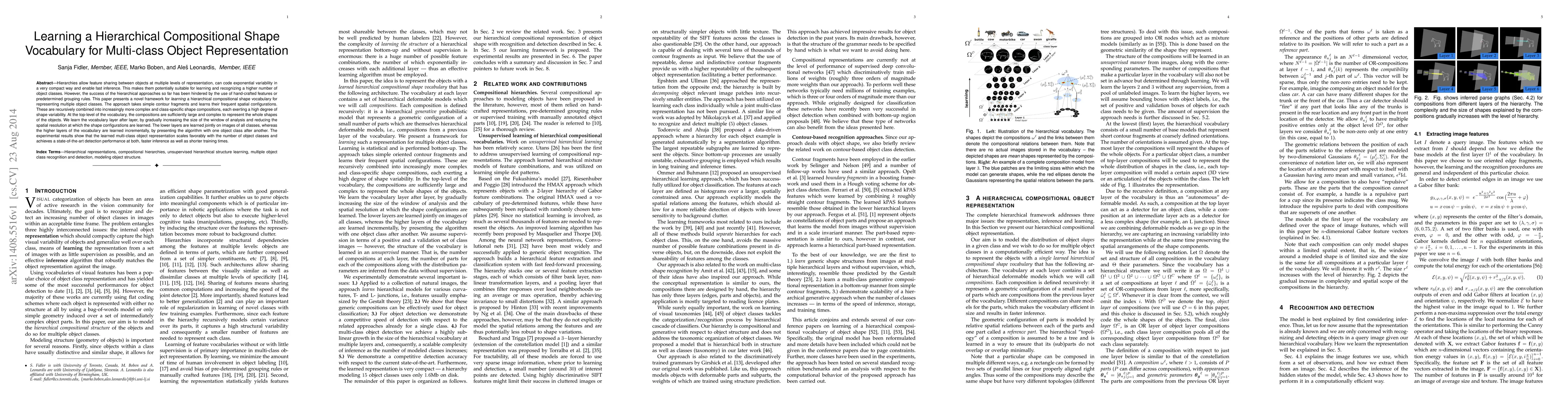 This paper introduces a novel framework for learning a hierarchical compositional shape vocabulary to represent multiple object classes. The approach automatically discovers simple contour fragments and their spatial configurations, recursively combining them into complex, class-specific shapes, achieving state-of-the-art detection performance with faster inference and shorter training times.