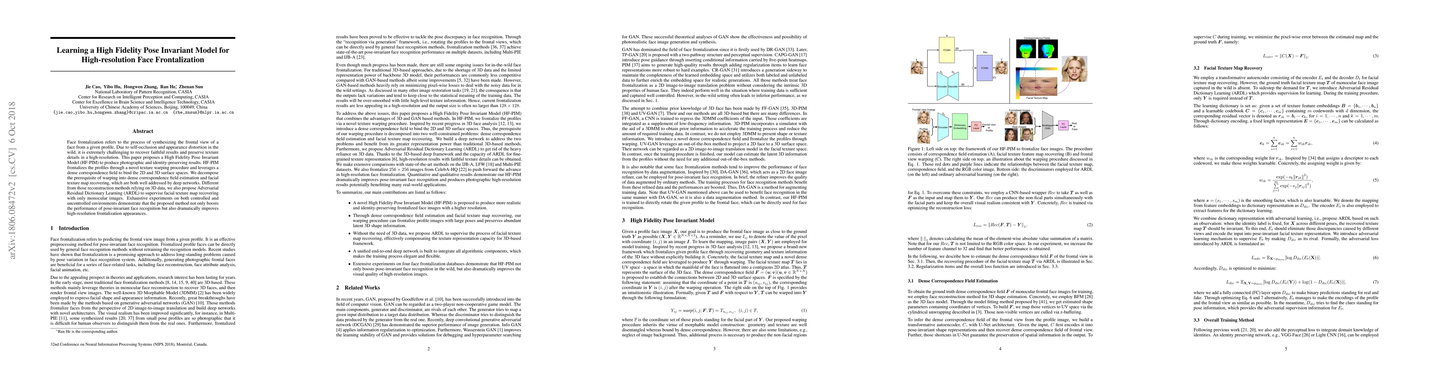 A new model, HF-PIM, improves face frontalization by warping profiles with a dense correspondence field and using adversarial residual dictionary learning to preserve texture details. The method boosts pose-invariant face recognition performance and produces high-resolution, identity-preserving results.