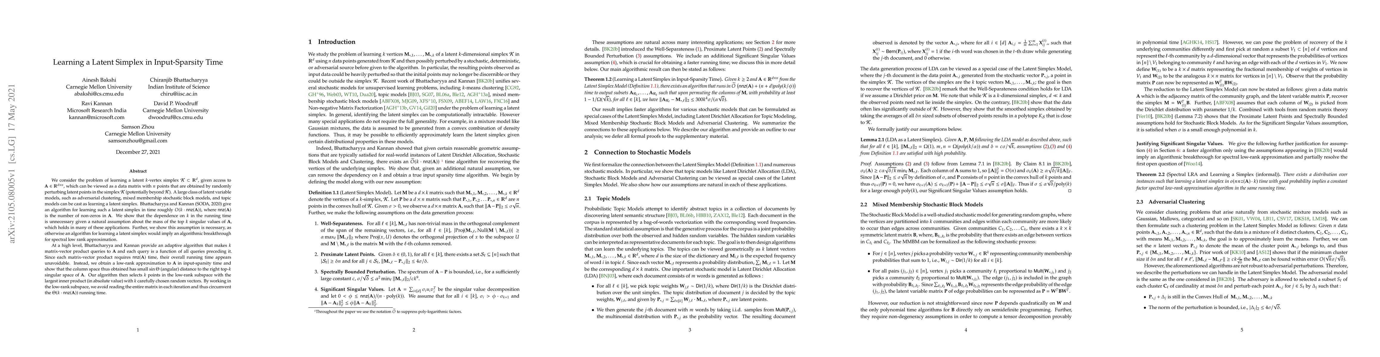 The paper proposes an algorithm to learn a latent simplex in input-sparsity time, avoiding the original $O(k imes nnz(A))$ running time by leveraging low-rank approximation of the data matrix.