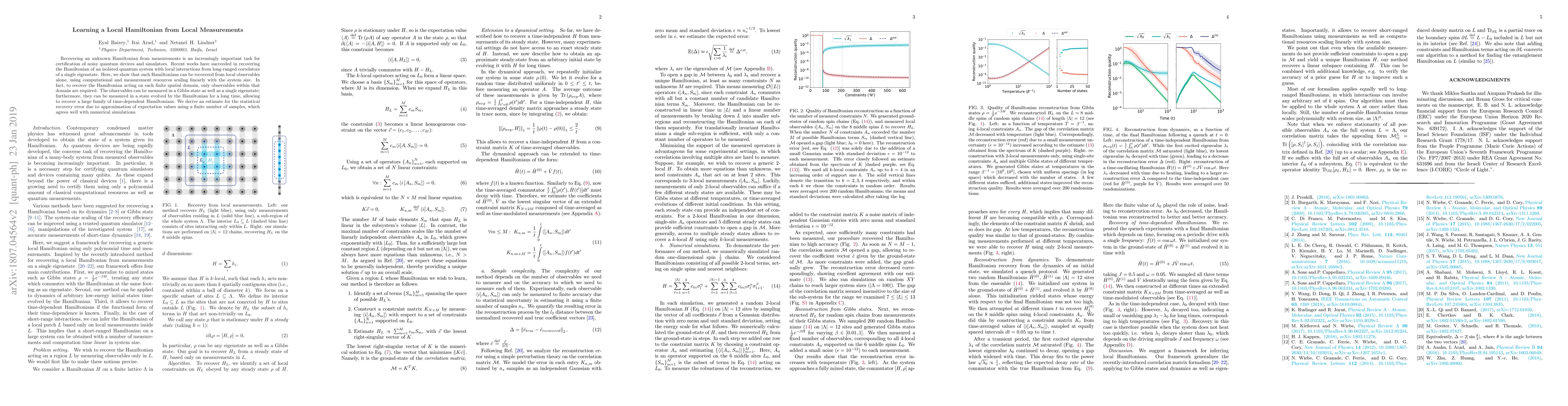 The research presents a method to recover unknown local Hamiltonians of quantum systems using local measurements, scaling linearly with system size. It demonstrates that Hamiltonians can be recovered from local observables alone, measured in Gibbs states, a single eigenstate, or a state evolved by the Hamiltonian for a long time, enabling recovery of time-dependent Hamiltonians.