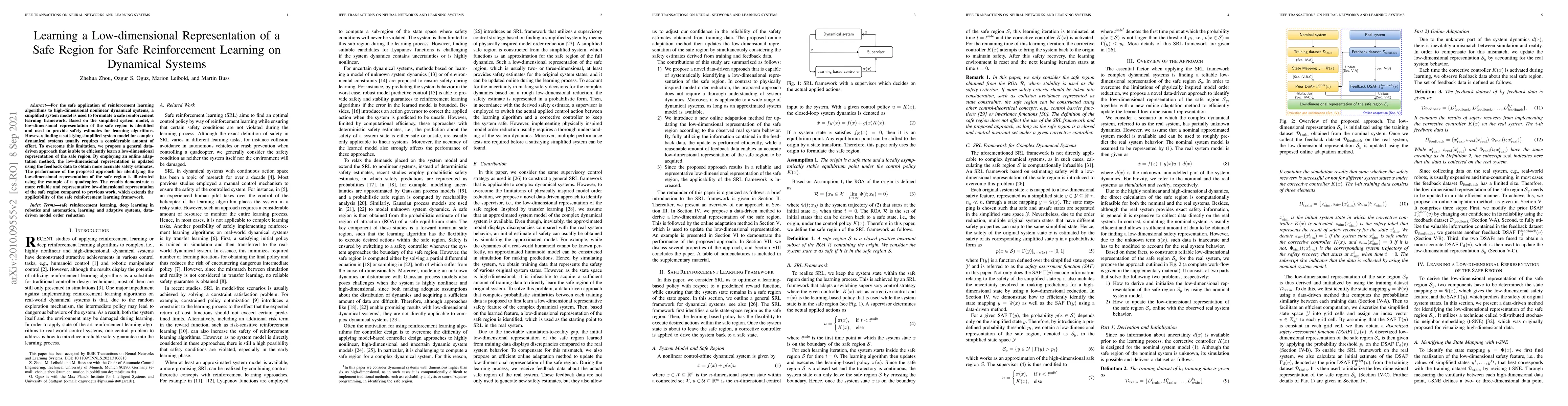 This paper proposes a data-driven approach to efficiently learn a low-dimensional representation of a safe region for reinforcement learning on high-dimensional nonlinear dynamical systems. The method uses online adaptation to update the representation based on feedback data, demonstrating improved safety estimates and reliability through a quadcopter example.