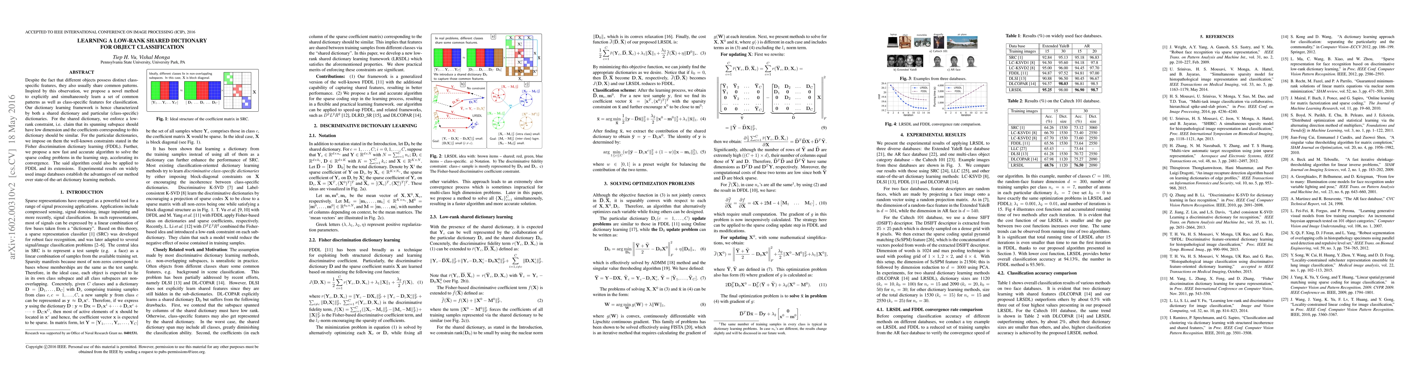 This paper proposes a novel method for object classification by learning a low-rank shared dictionary alongside class-specific dictionaries, aiming to capture both common and distinct features. The method employs a fast algorithm to solve the sparse coding problems, demonstrating superior performance compared to other dictionary learning techniques.
