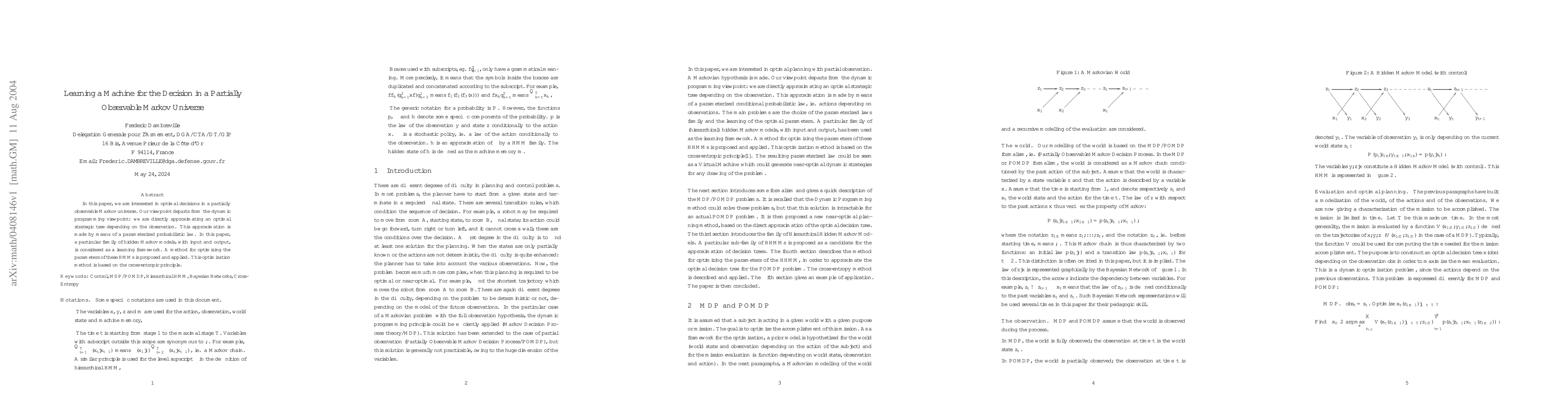 In this paper, we are interested in optimal decisions in a partially observable Markov universe. Our viewpoint departs from the dynamic programming viewpoint: we are directly approximating an optimal strategic tree depending on the observation. This approximation is made by means of a parameterized probabilistic law. In this paper, a particular family of hidden Markov models, with input and output, is considered as a learning framework. A method for optimizing the parameters of these HMMs is proposed and applied. This optimization method is based on the cross-entropic principle.