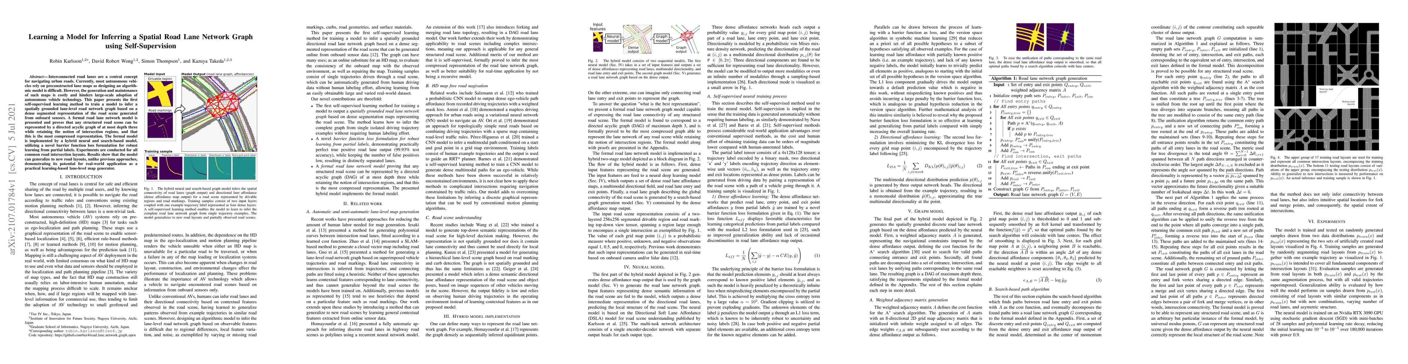 Interconnected road lanes are a central concept for navigating urban roads. Currently, most autonomous vehicles rely on preconstructed lane maps as designing an algorithmic model is difficult. However, the generation and maintenance of such maps is costly and hinders large-scale adoption of autonomous vehicle technology. This paper presents the first self-supervised learning method to train a model to infer a spatially grounded lane-level road network graph based on a dense segmented representation of the road scene generated from onboard sensors. A formal road lane network model is presented and proves that any structured road scene can be represented by a directed acyclic graph of at most depth three while retaining the notion of intersection regions, and that this is the most compressed representation. The formal model is implemented by a hybrid neural and search-based model, utilizing a novel barrier function loss formulation for robust learning from partial labels. Experiments are conducted for all common road intersection layouts. Results show that the model can generalize to new road layouts, unlike previous approaches, demonstrating its potential for real-world application as a practical learning-based lane-level map generator.