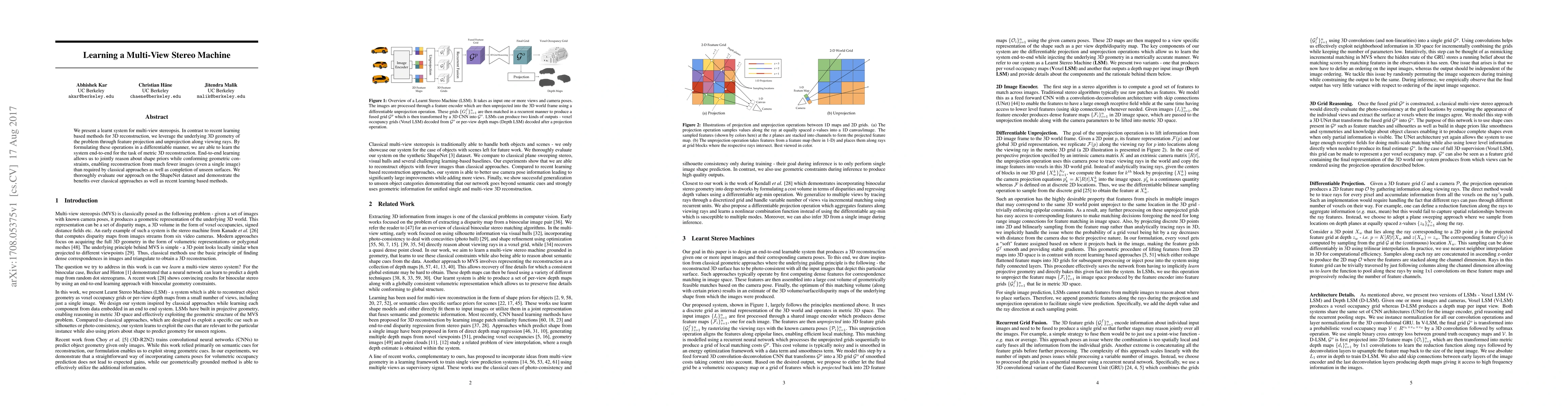This paper introduces a learned system for multi-view stereopsis that leverages 3D geometry through differentiable feature projection and unprojection. The end-to-end learning approach enables metric 3D reconstruction from fewer images and unseen surfaces, outperforming classical and recent learning-based methods, as demonstrated on the ShapeNet dataset.