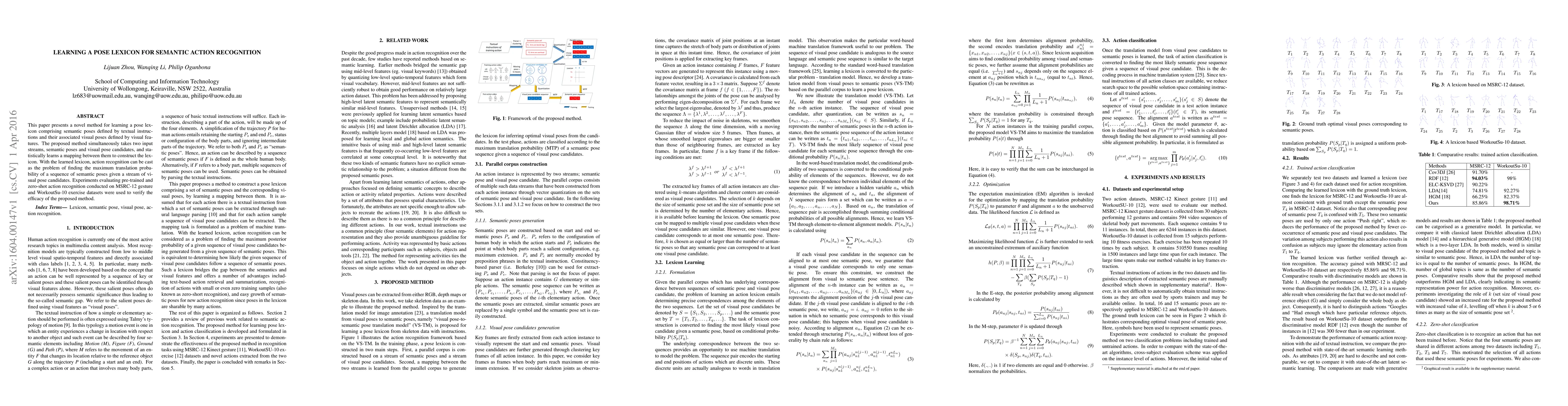 This paper introduces a method to create a pose lexicon by mapping semantic poses defined by textual instructions to visual poses using statistical learning. The resulting lexicon enables action recognition by identifying the most probable translation of a sequence of semantic poses in visual data, validated through pre-trained and zero-shot recognition experiments on gesture and exercise datasets.